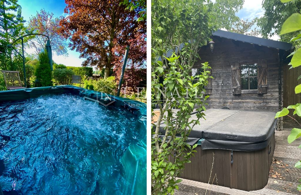 De charmants espaces de détente se succèdent : un petit coin ombragé sous une ombrelle, puis un chalet en bois doté d’une terrasse accueillant un swim spa, combinant jacuzzi et couloir de nage, idéal pour la relaxation comme pour le sport. Attenant au chalet, un grand abri complète l’ensemble, offrant praticité et confort.