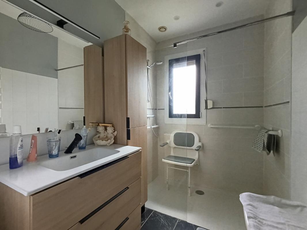 Elle se compose d'une entrée avec placards, d'une pièce de vie de plus de 30 m² avec cuisine ouverte, ouvrant directement sur une terrasse plein sud sans vis à vis, d'un wc, d'un dégagement desservant deux chambres et une salle d'eau rénovée également.