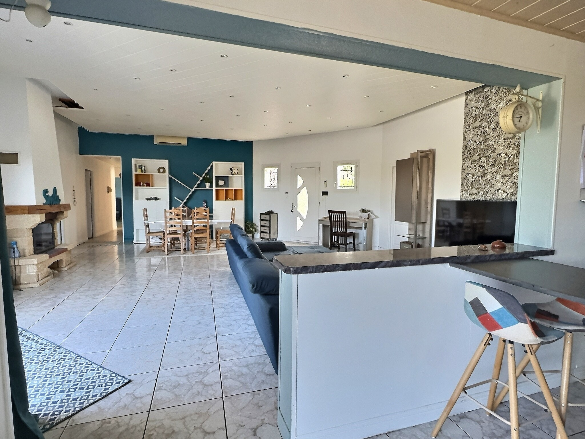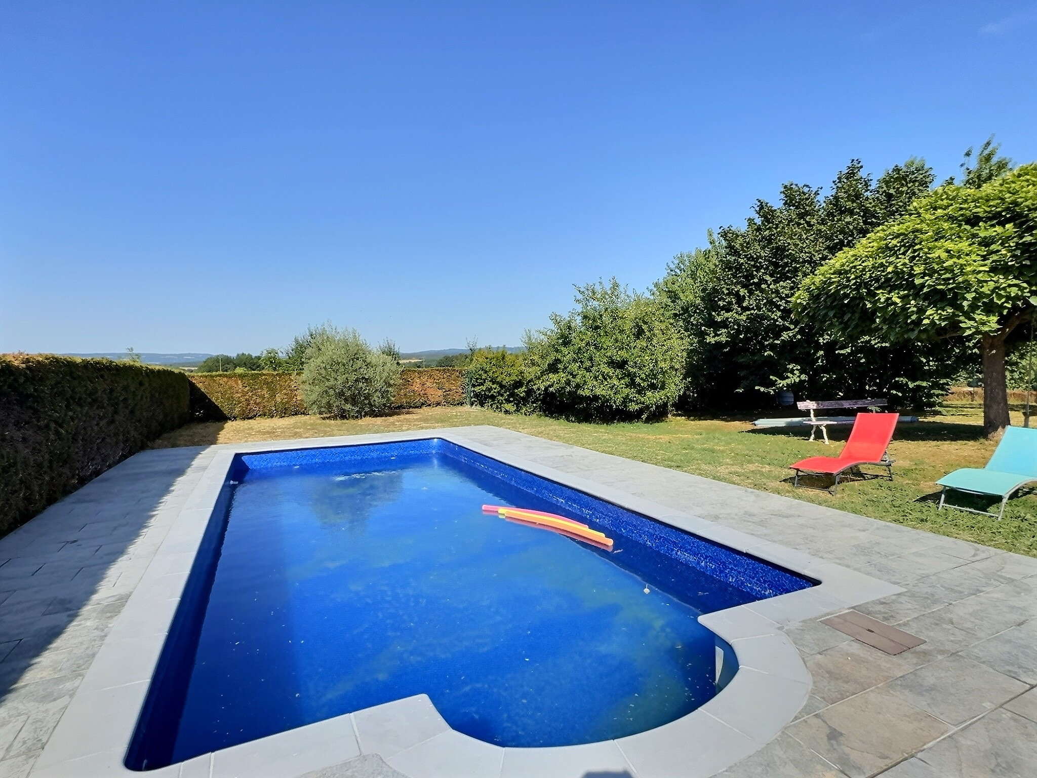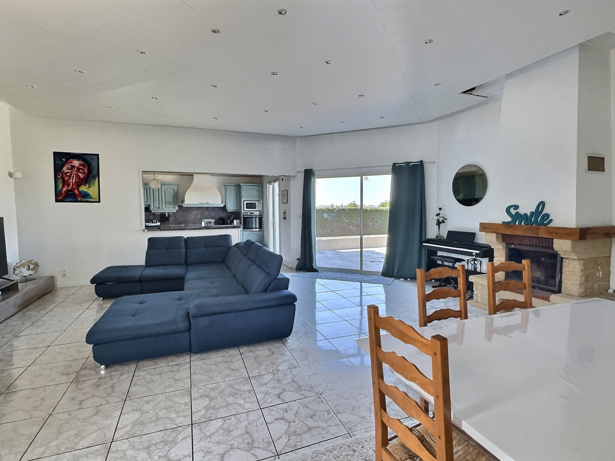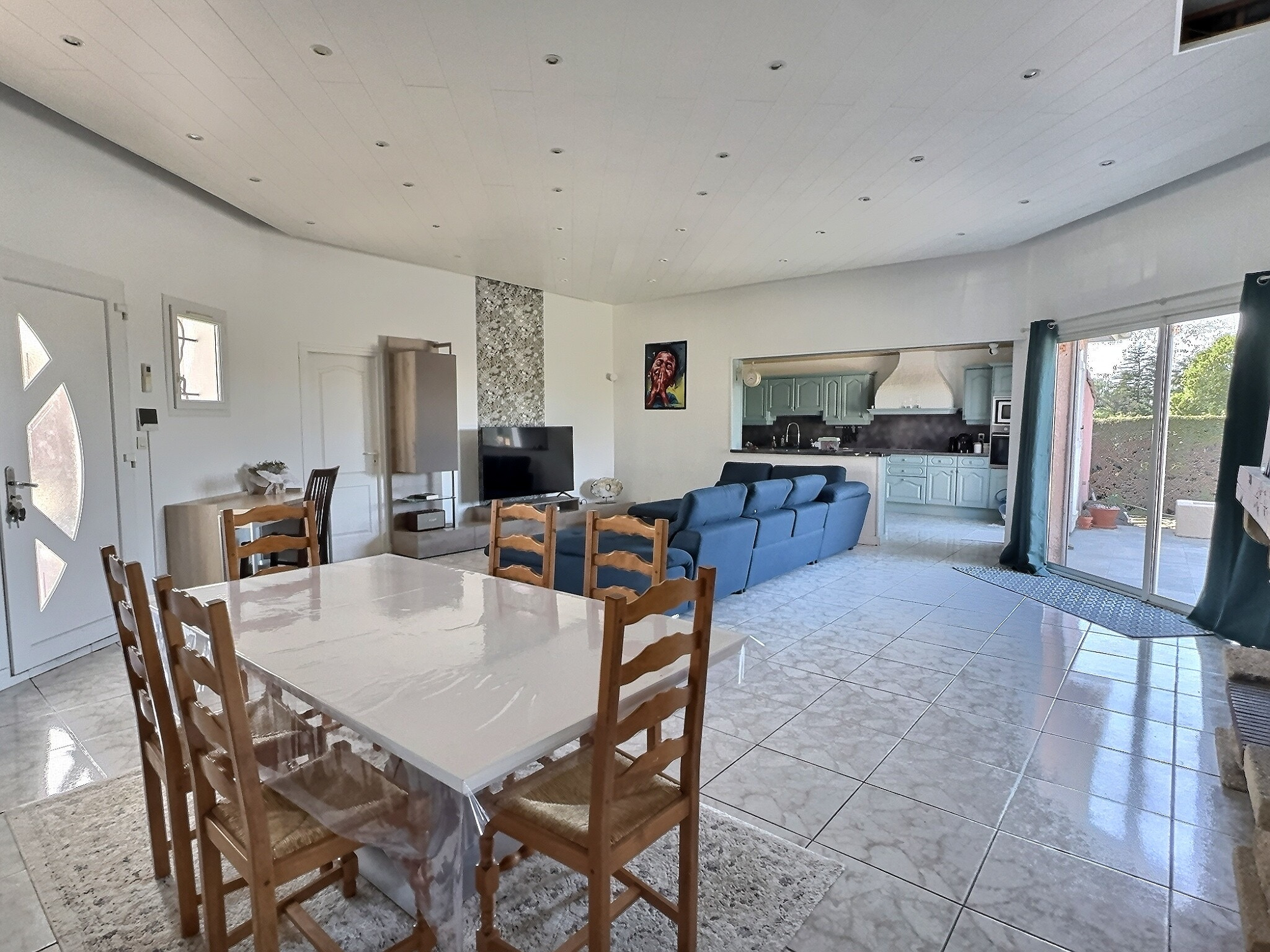 La pièce de vie s'ouvre sur la terrasse trés agréable avec la piscine et le jardin arboré et paysagé, idéal pour profiter des beaux jours avec une vue sur la campagne.
