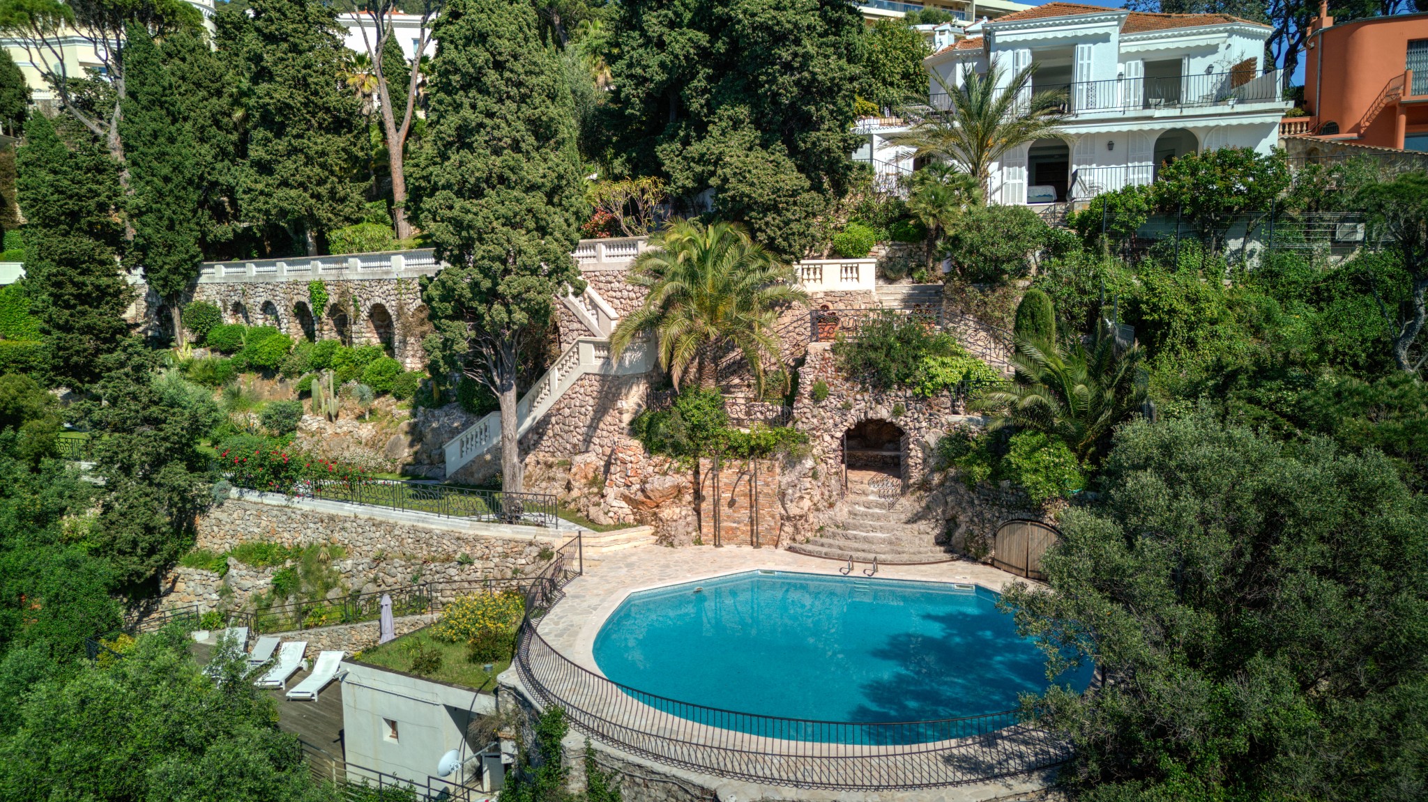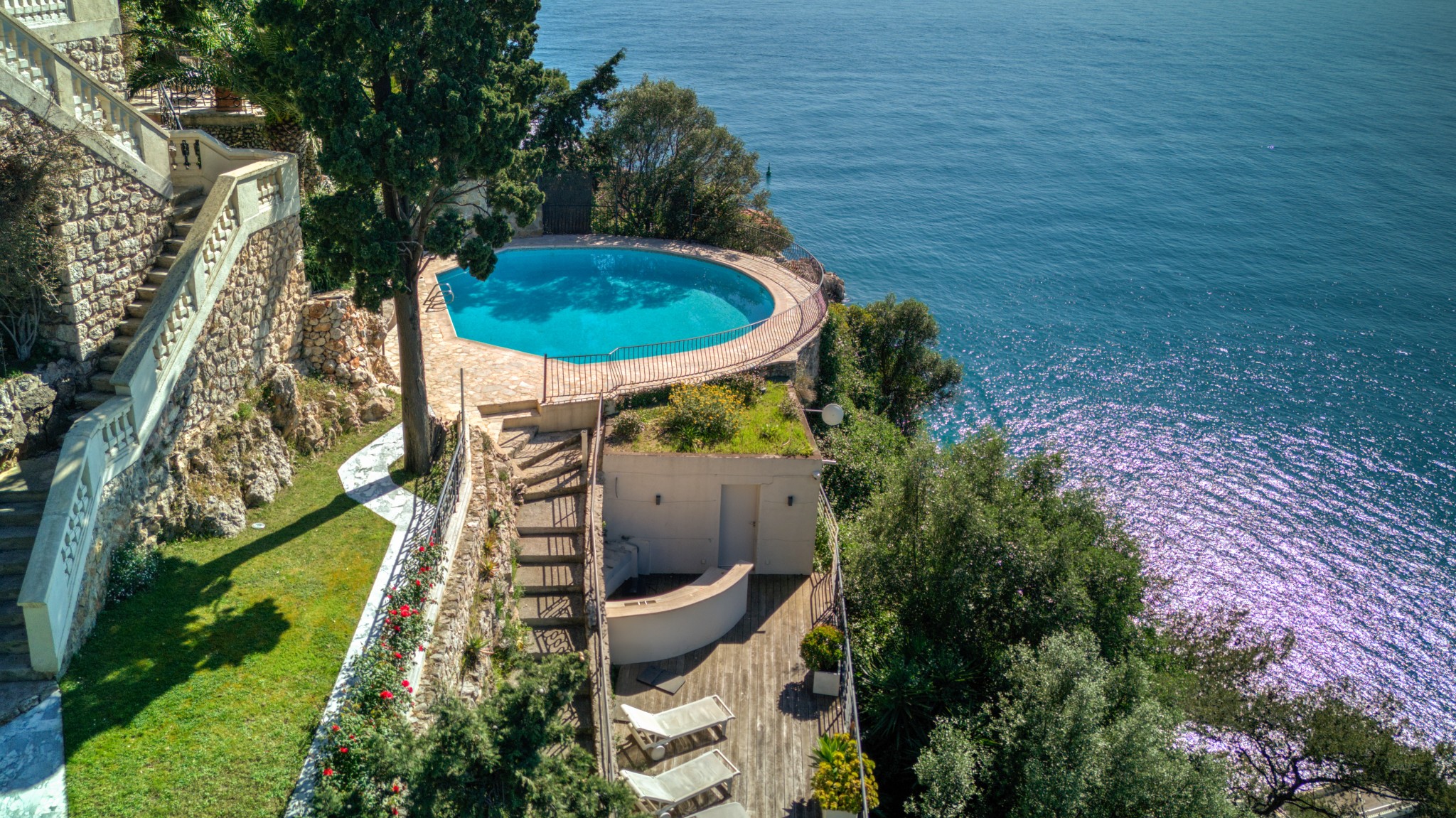 Le niveau inférieur dessert trois chambres, chacune avec salle d'eau et toilettes privatifs, ainsi qu'une buanderie. Les extérieurs sont composés de plusieurs terrasses, d'un garage de 19 m² et d'une piscine au charme unique avec un accès creusé dans la roche, face à la mer.