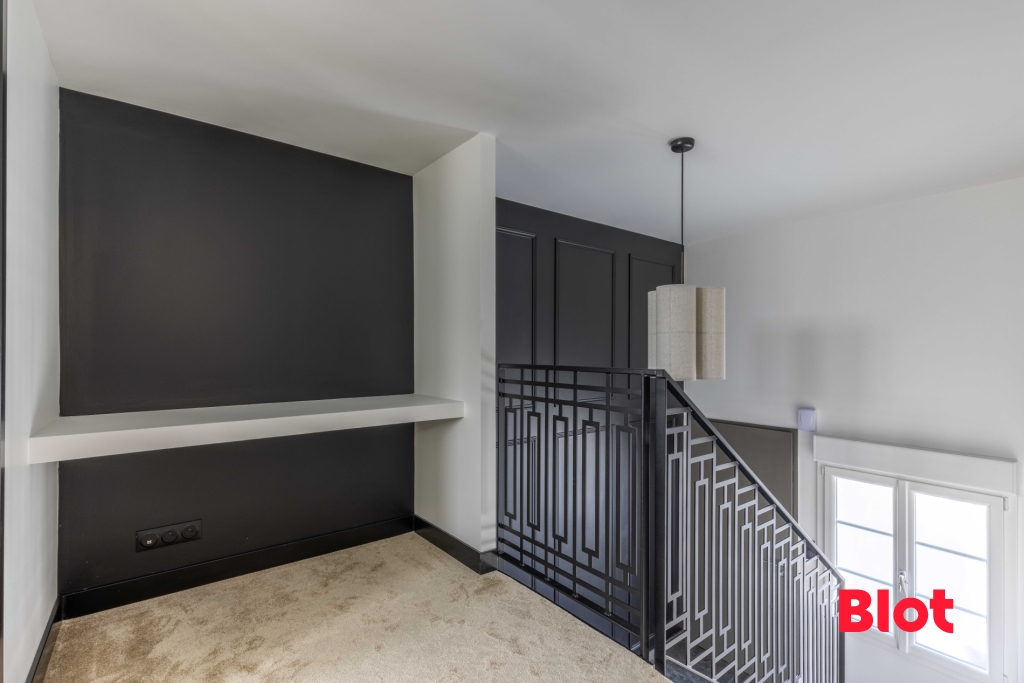 À l'étage, le coin nuit s'organise autour d'un espace bureau, d'une grande salle de bains lumineuse avec fenêtre, d'un WC séparé, ainsi que de trois belles chambres allant de 11,35 m² à 14,74 m². L'une d'elles bénéficie d'une mezzanine de 27 m² au sol, idéale pour un adolescent, une salle de jeux ou un espace de télétravail.