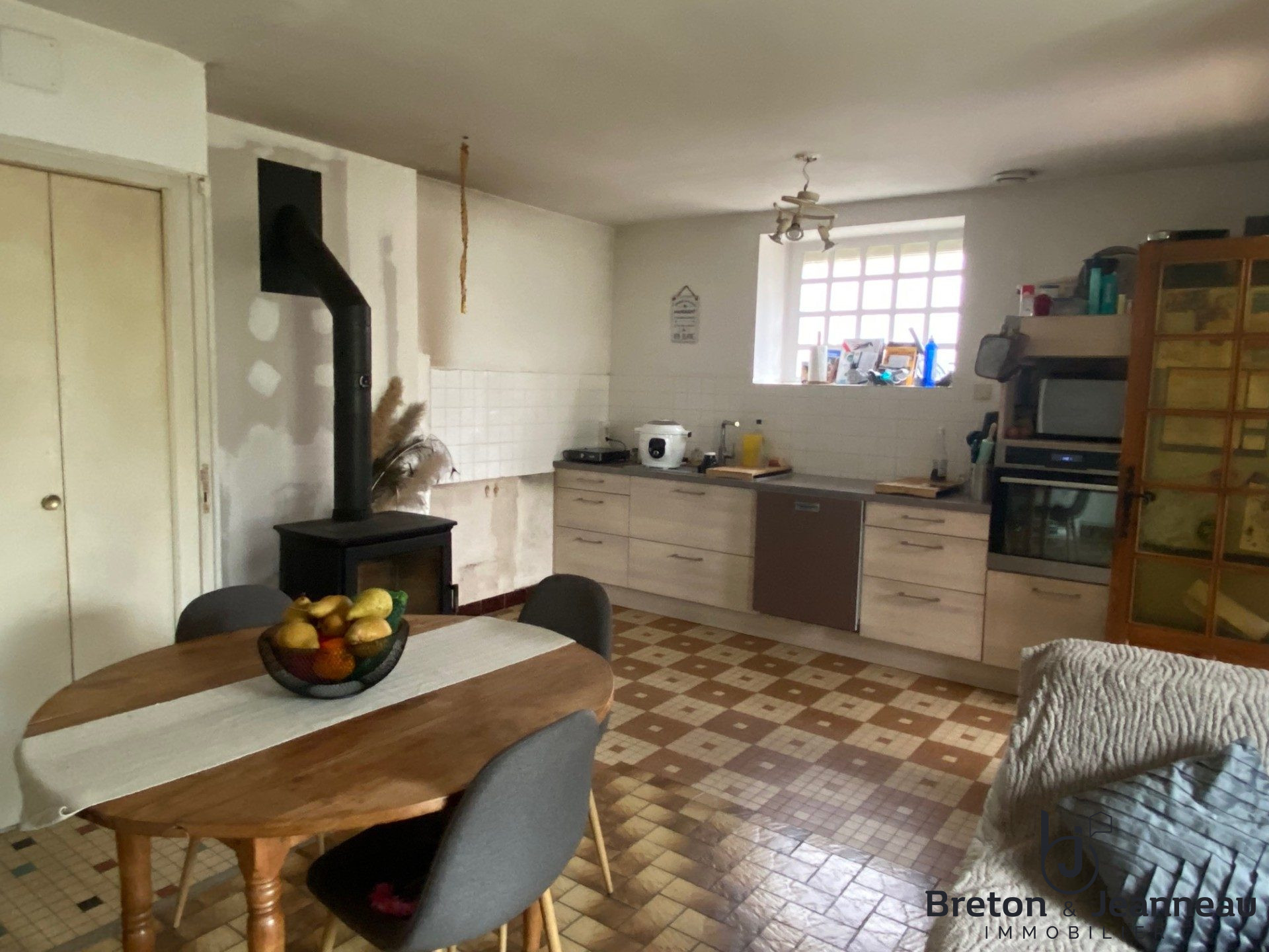 Plein centre-bourg, elle se compose au rez-de-chaussée d'une entrée, un séjour avec poêle à bois et cuisine ouverte non aménagée, WC, salle d'eau avec douche lavabo bidet, buanderie avec sortie extérieure.