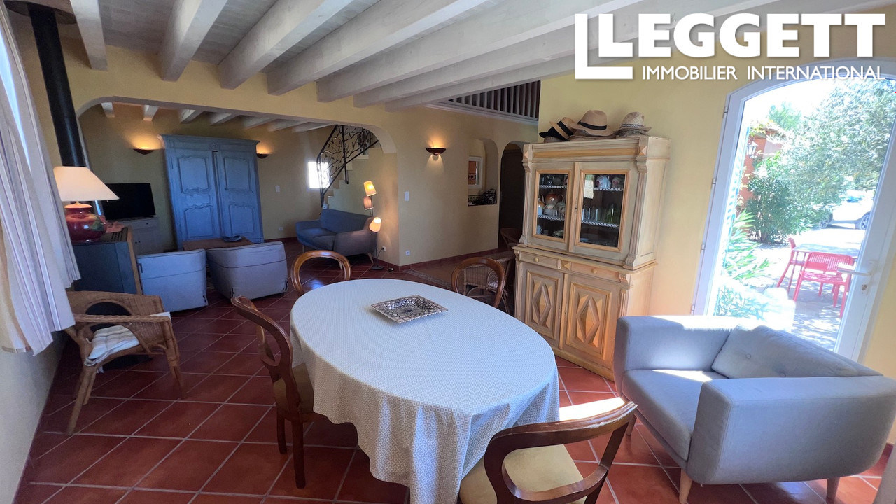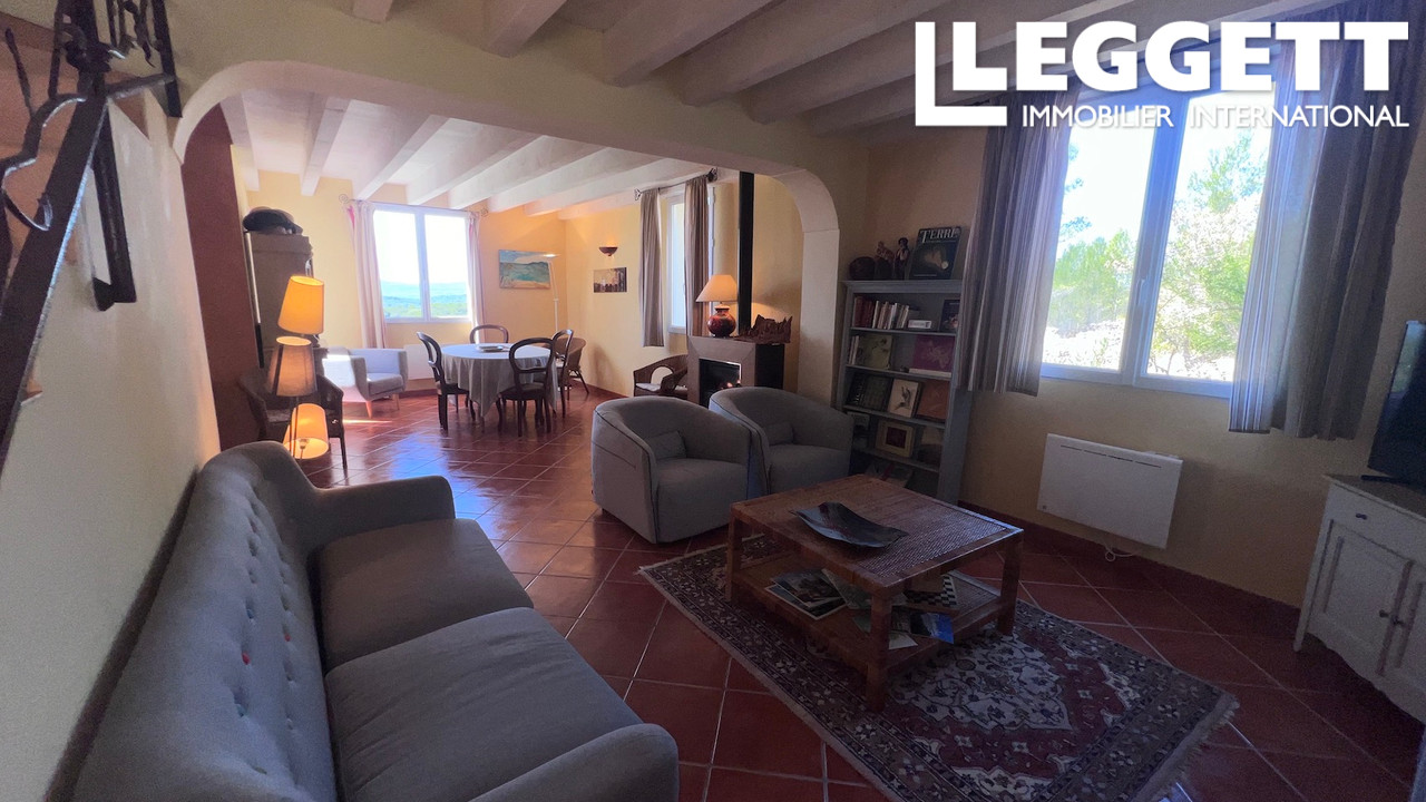 A39553GWI83 - MAISON - COTIGNAC - Entre les Gorges du Verdon et la Côte d'Azur, cette charmante maison provençale est située à proximité du village unique de Cotignac, labellisé Plus Beaux Villages de France depuis 2022. Proche de toutes commodités, cette charmante maison est nichée au coeur d'un terrain de plus de 5 600 m² arboré de nombreuses essences méditerranéennes. Intimiste et paisible, elle offre une vue panoramique unique et exceptionnelle sur la campagne environnante. Le jardin agrémenté d'une belle piscine avec de larges plages dallées. Confortable séjour/salle à manger, cuisine ouverte équipée, grande terrasse exposée sud, 1 chambre et salle d'eau avec WC. Un escalier avec une belle rampe en fer forgé mène à l'étage : dégagement, 2 chambres, salle d'eau avec WC et 1 grand débarras. Un studio indépendant accueille les hôtes avec kitchenette, coin nuit et salle d'eau avec WC. Terrasse ombragée entre la maison et le studio. Garage avec mezzanine. Située dans un quartier recherche.