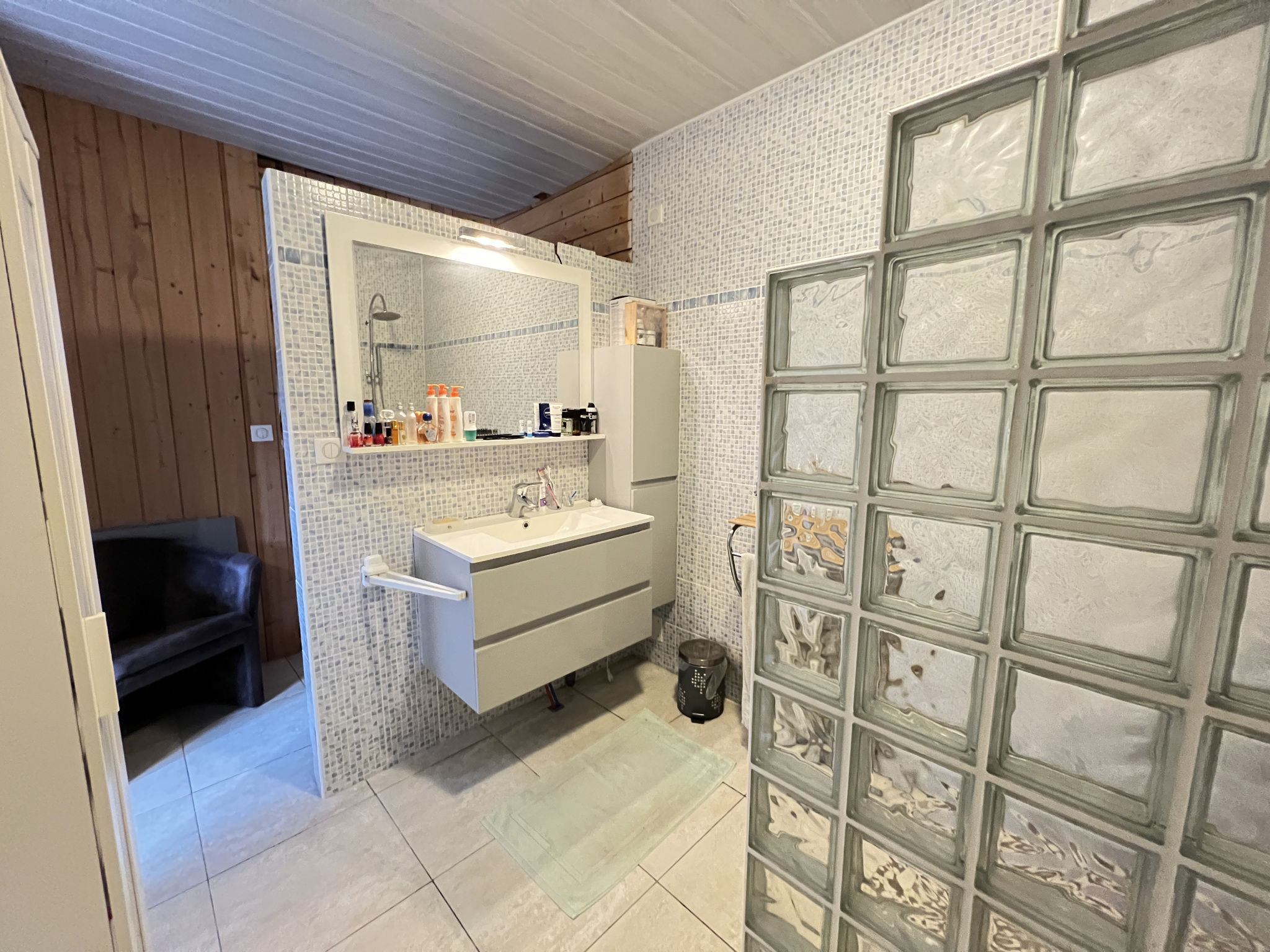 Située dans un qtr. résidentiel très calme avec des champs et la campagne en face, une maison de plain pied avec 5 pièces principales dont grande pièce à vivre de plus de 70 m2 donnant sur une terrasse couverte et 4 chambres avec salle d'eau pour chaque chambre plus mezzanine