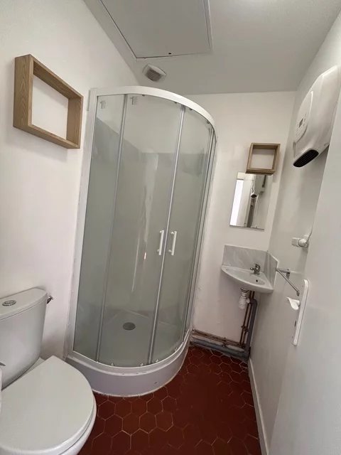 Au premier étage d'une petite copropriété de 5 lots, cet espace entièrement rénové dispose d'une partie cuisine avec coin repas et d'un espace sommeil, de rangements et d'une salle d'eau avec douche et WC.