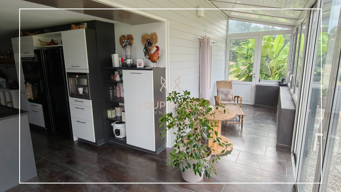Elle se compose au rez-de-chaussée d'une vaste cuisine ouverte sur salle à manger, d'un second espace salle à manger, d'un salon cocooning avec fenêtre oeil de boeuf, d'une véranda lumineuse, d'une buanderie et d'une suite parentale.