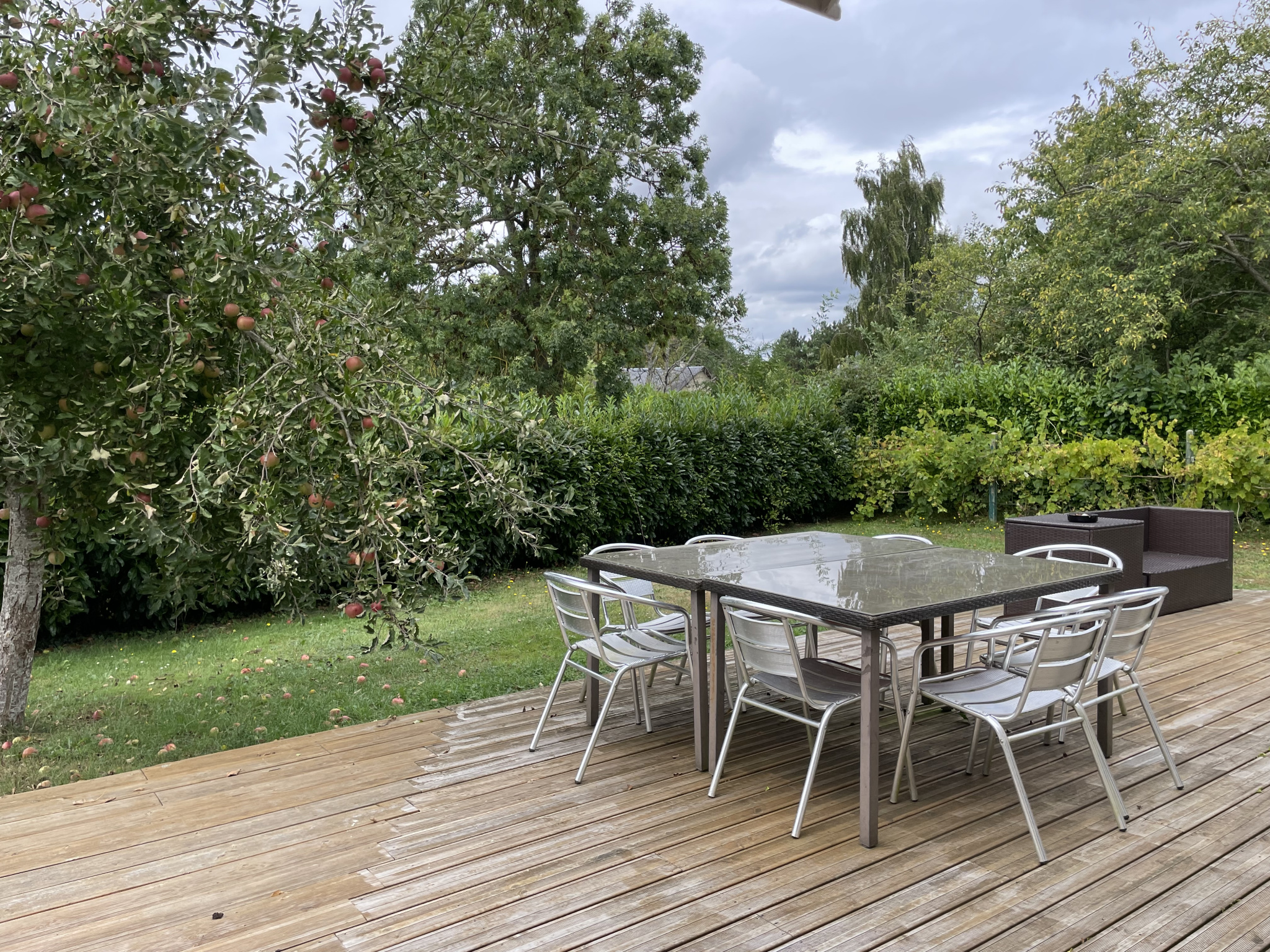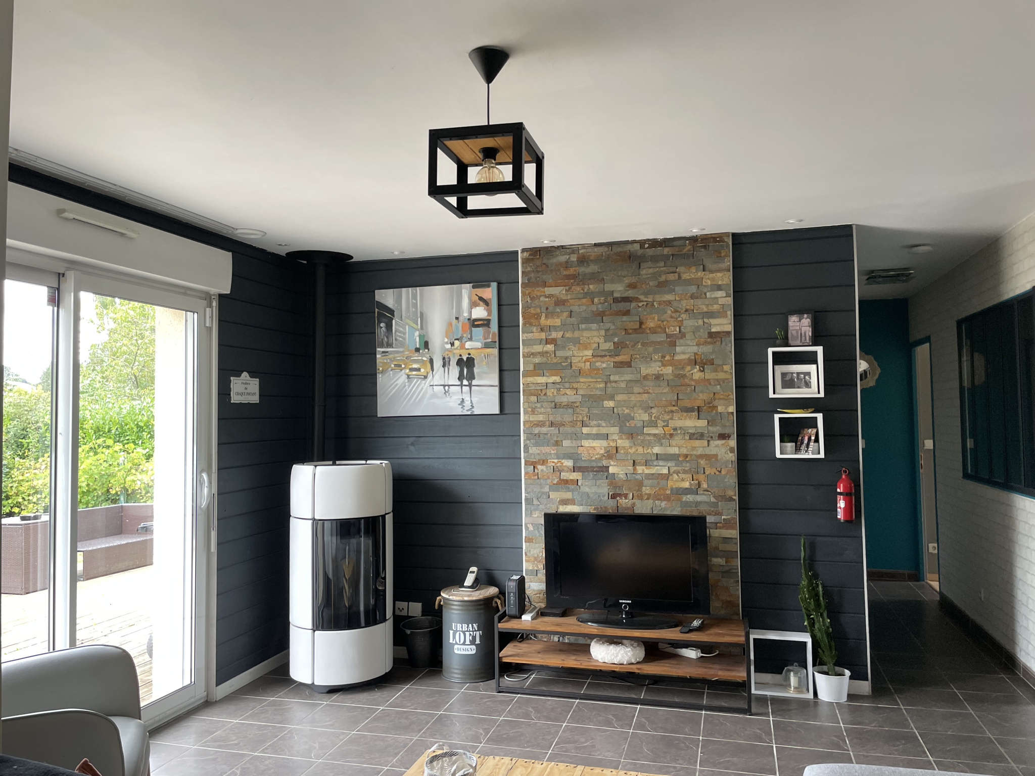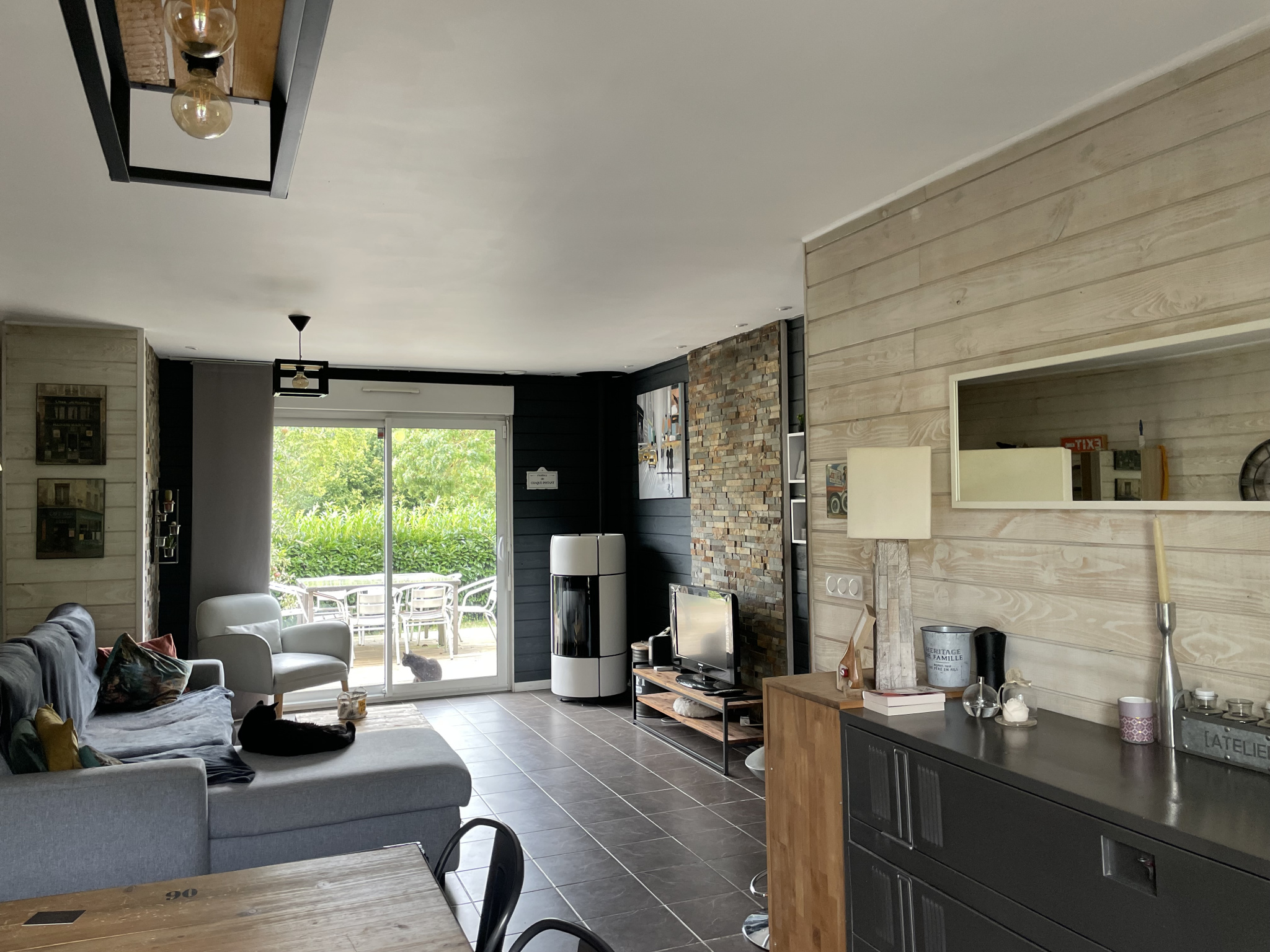 Rdc: Entrée avec rangements, bel espace de vie avec baies vitrées ouvrant sur la terrasse et poele à pellets, cuisine aménagée et équipée récente et contemporaine avec îlot central, espace bureau avec rangements et accès à l'étage, 2 chambres avec rangements, salle de bains avec douche, wc.