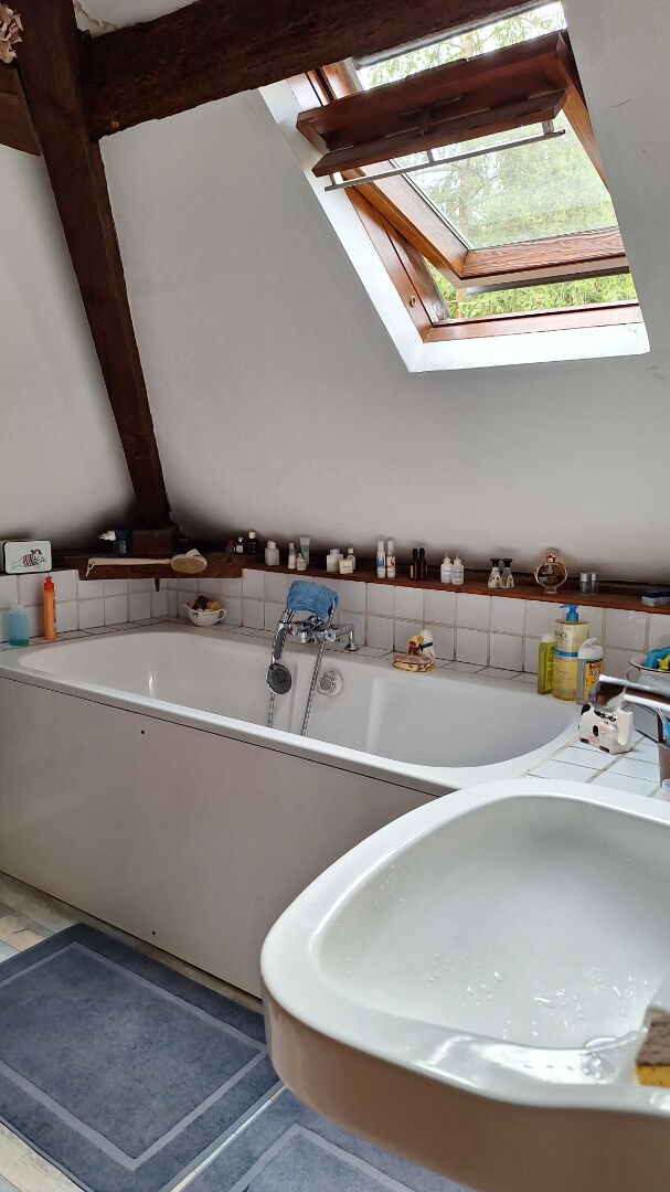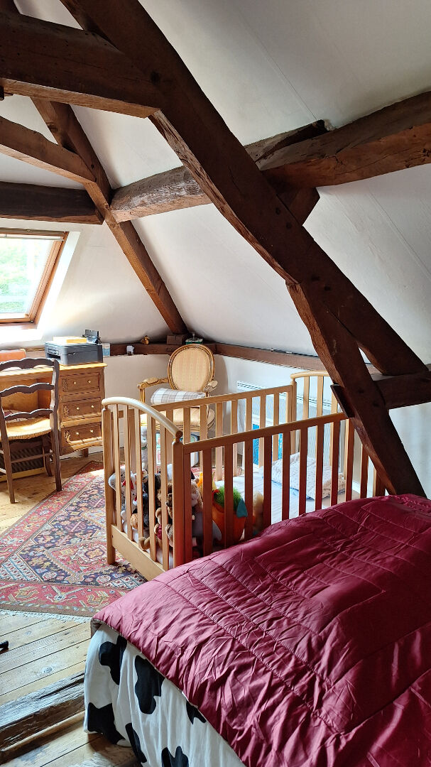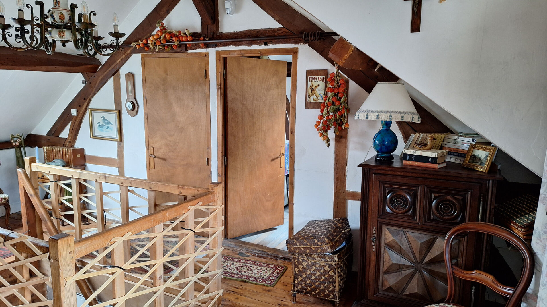 À l'étage, un vaste palier dessert deux chambres et une salle de bains avec WC.
