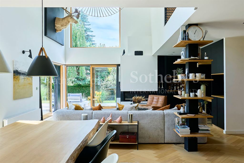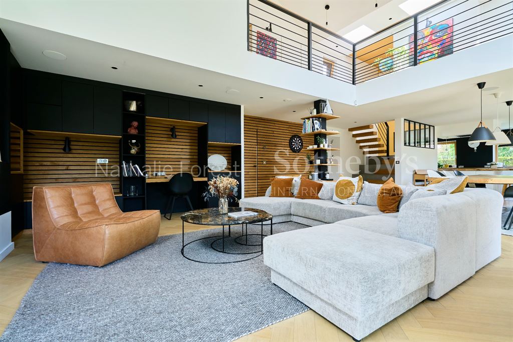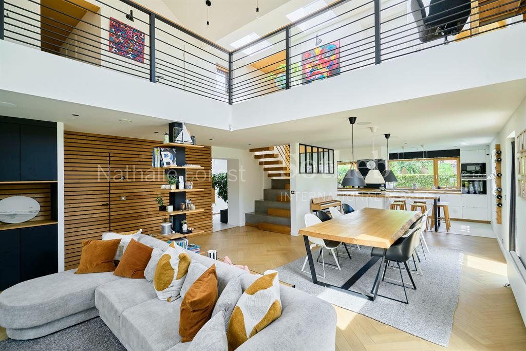 Dès l’entrée, l’effet «?waouh?» est immédiat : un vaste espace de vie cathédrale de plus de 75 m², sublimé par une hauteur sous plafond impressionnante, des poutres apparentes et de larges ouvertures qui inondent les lieux de lumière naturelle. L’agencement fluide et élégant comprend une cuisine américaine haut de gamme, une salle à manger conviviale et un salon ultra cosy avec cheminée à gaz, le tout dans un esprit open space contemporain et chaleureux.