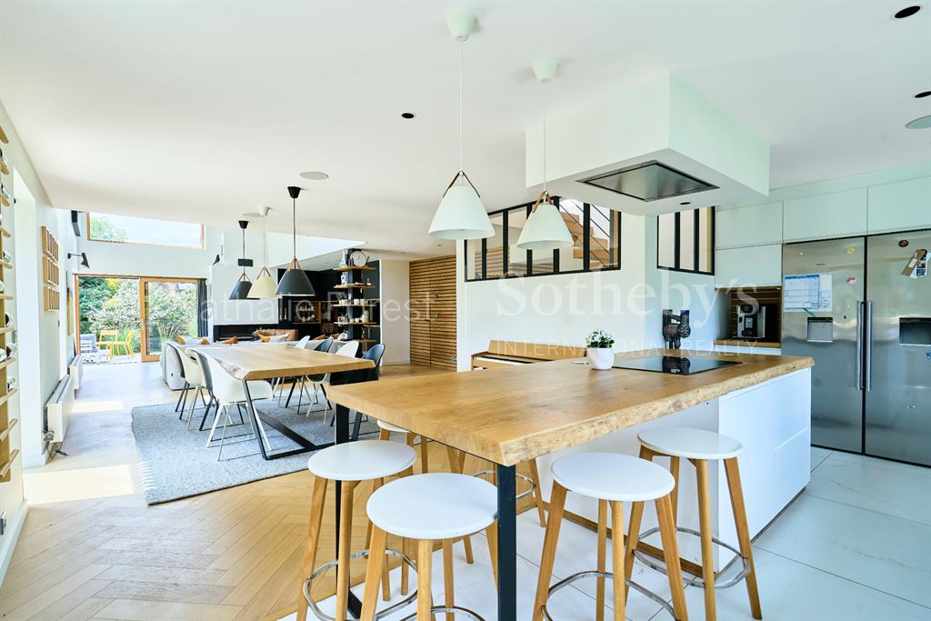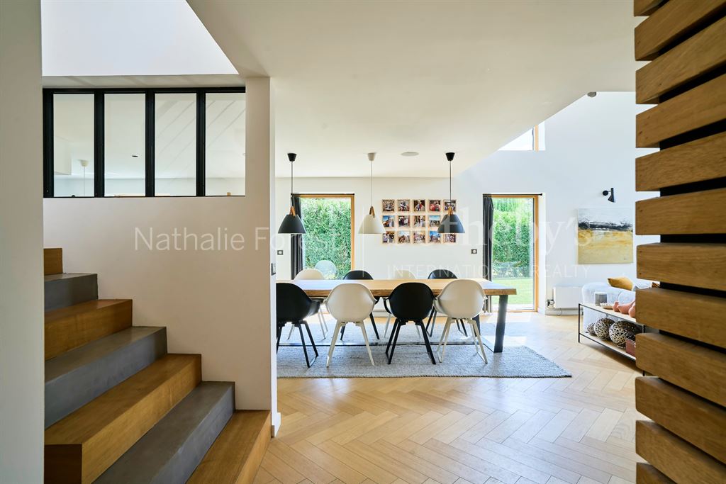 Côté technique : VMC double flux, isolation en laine de roche, système audio Sonos intégré, double vitrage bois avec capotage aluminium extérieur, volets roulants motorisés avec commande centralisée.