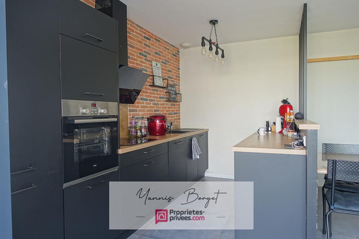 Un espace de vie généreux réunit un séjour lumineux avec son poêle à granulés et un salon conviviale, communiquant avec une cuisine équipée de nombreux éléments (plaque, four, hotte, réfrigérateur, lave-vaisselle).