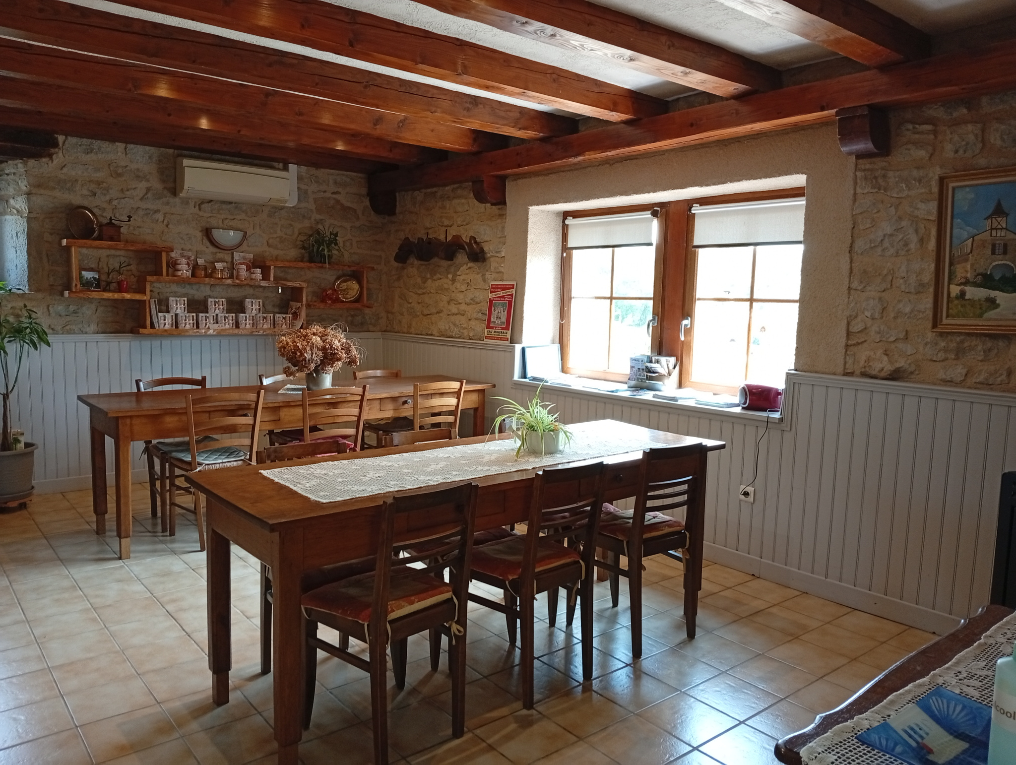 La seconde maison, ancienne grange avec pigeonnier (environ 136 m2), a été entièrement rénovée et exploitée en maison d'hôtes. Elle comprend une salle à manger, une cuisine équipée, une buanderie et un grand garage. À l'étage, quatre élégantes suites climatisées, chacune avec salle d'eau et WC privatifs, offrent confort et intimité.