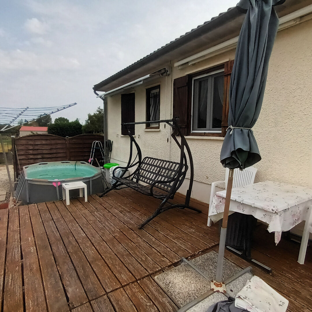 À l'arrière, une terrasse en bois avec une petite piscine hors sol.