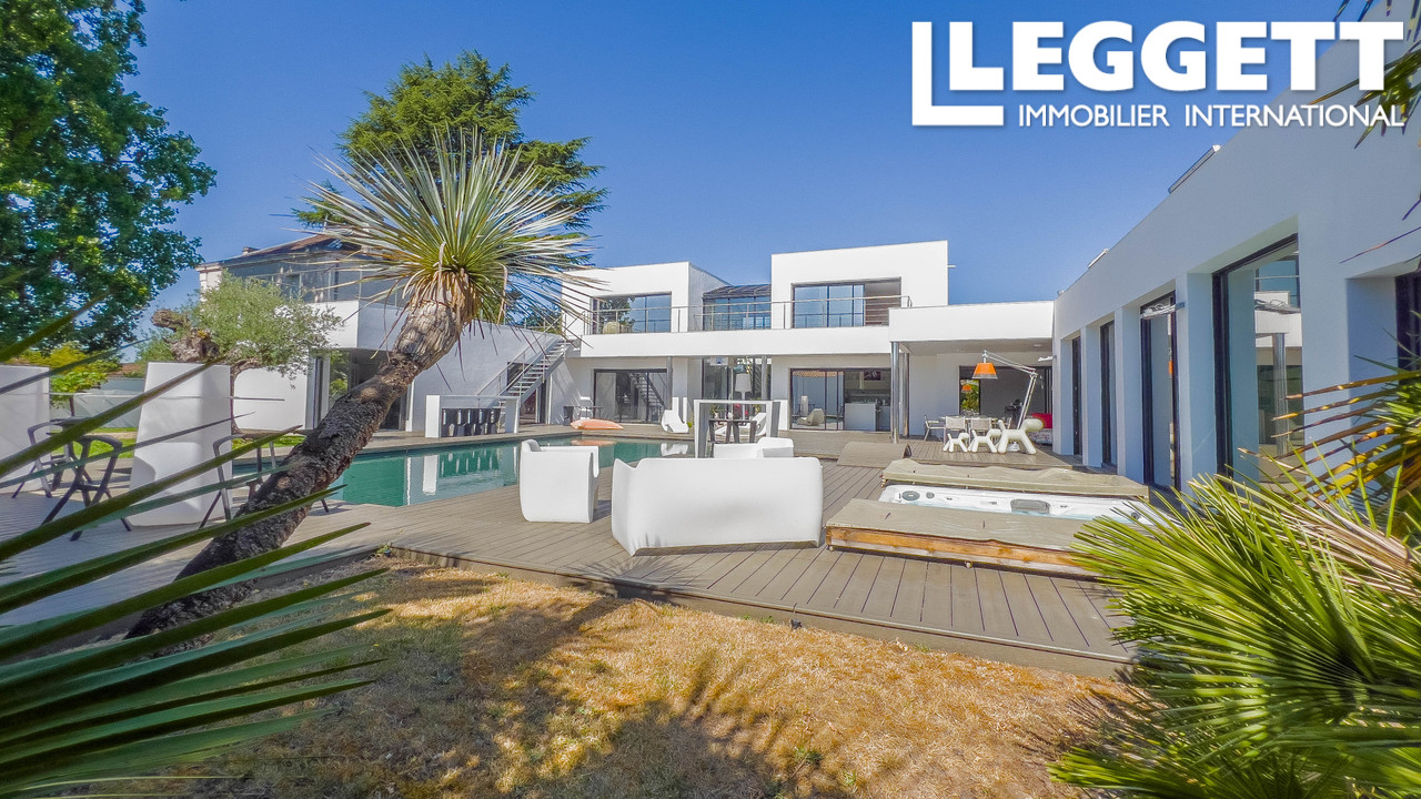 A38705DGE16 - Construction 2008 pour ce bien d'exception proposant 5 chambres en suite, bureau, piscine intérieure, extérieure et couloir de nage sous terrasses en bois immergeables, le tout sur terrain clos et arboré avec grand car port et cuisine d'été indépendante
