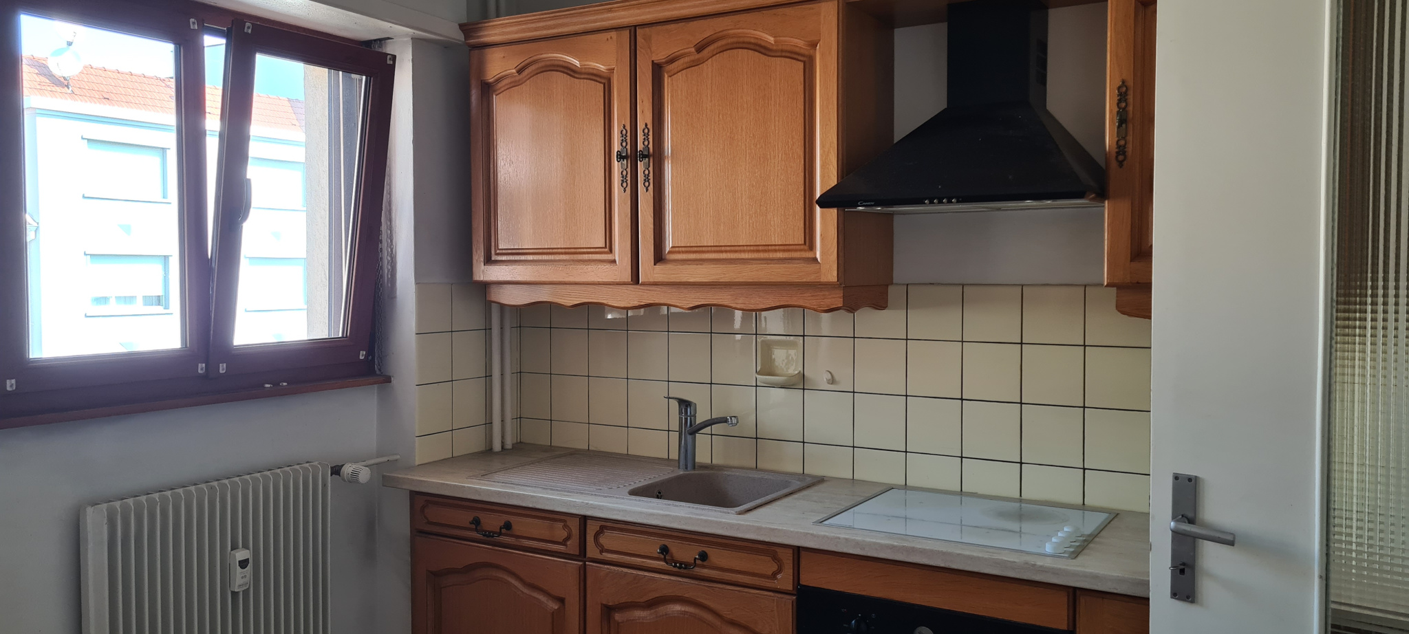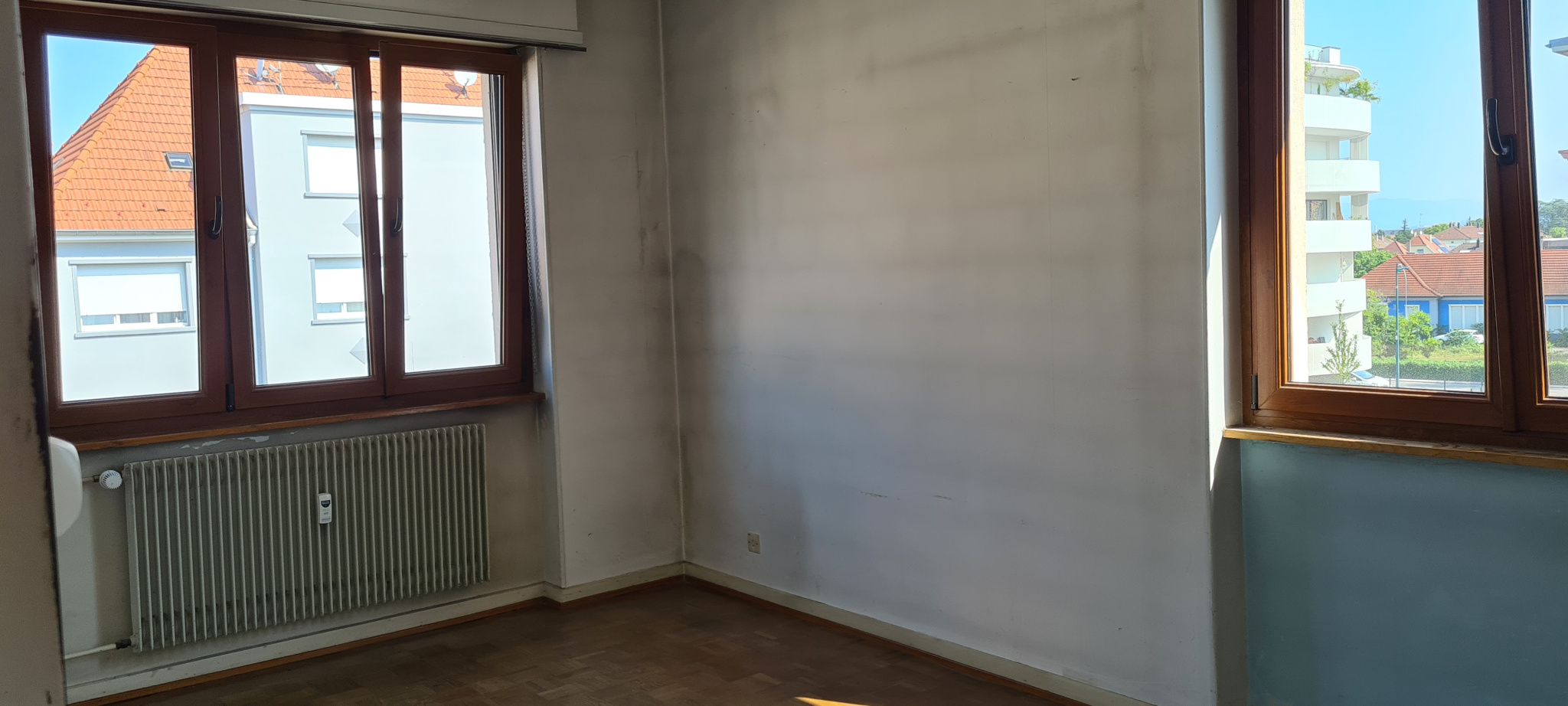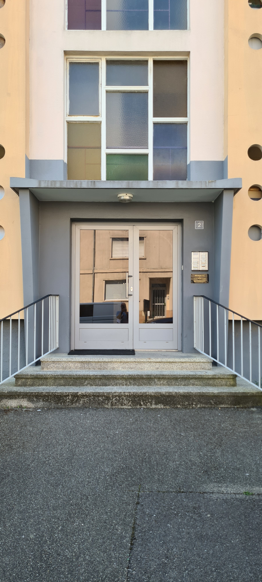 Au 2ème étage avec ascenseur, appartement lumineux au calme, séjour avec double porte-fenêtre sur l'arrière du batiment (sud), cuisine équipée avec logia/balcon, 2 chambres à coucher, salle de bains avec placards baignoire et fenêtre, wc, vaste entrée, une cave. Possibilité de parking à l'arrière de la résidence. Appartement proches commodités et frontière de Bâle.Disponible immédiatement Chauffage collectif, fenetres pvc double vitrage et tableau électrique rénové. Des travaux de sanitaires et de décorations sont à prévoir.