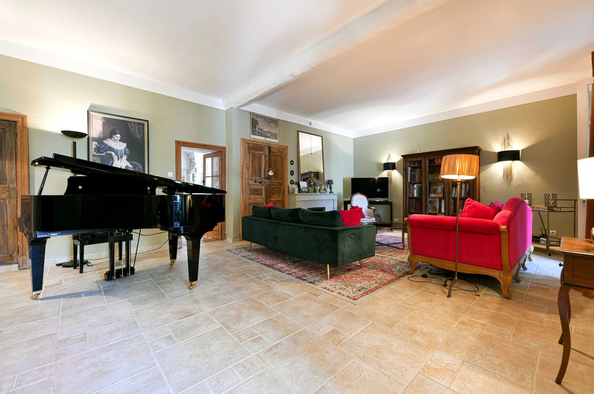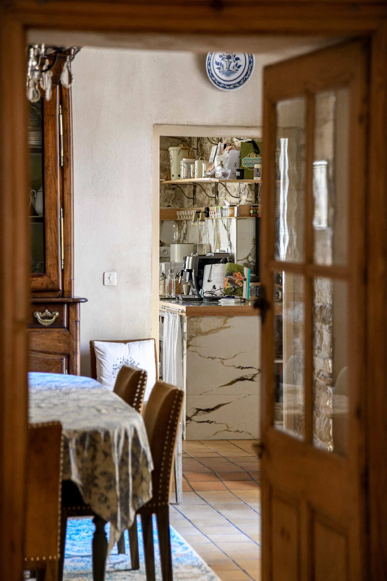 Salon/séjour ouvert sur cour et piscine, grande cuisine avec large cellier