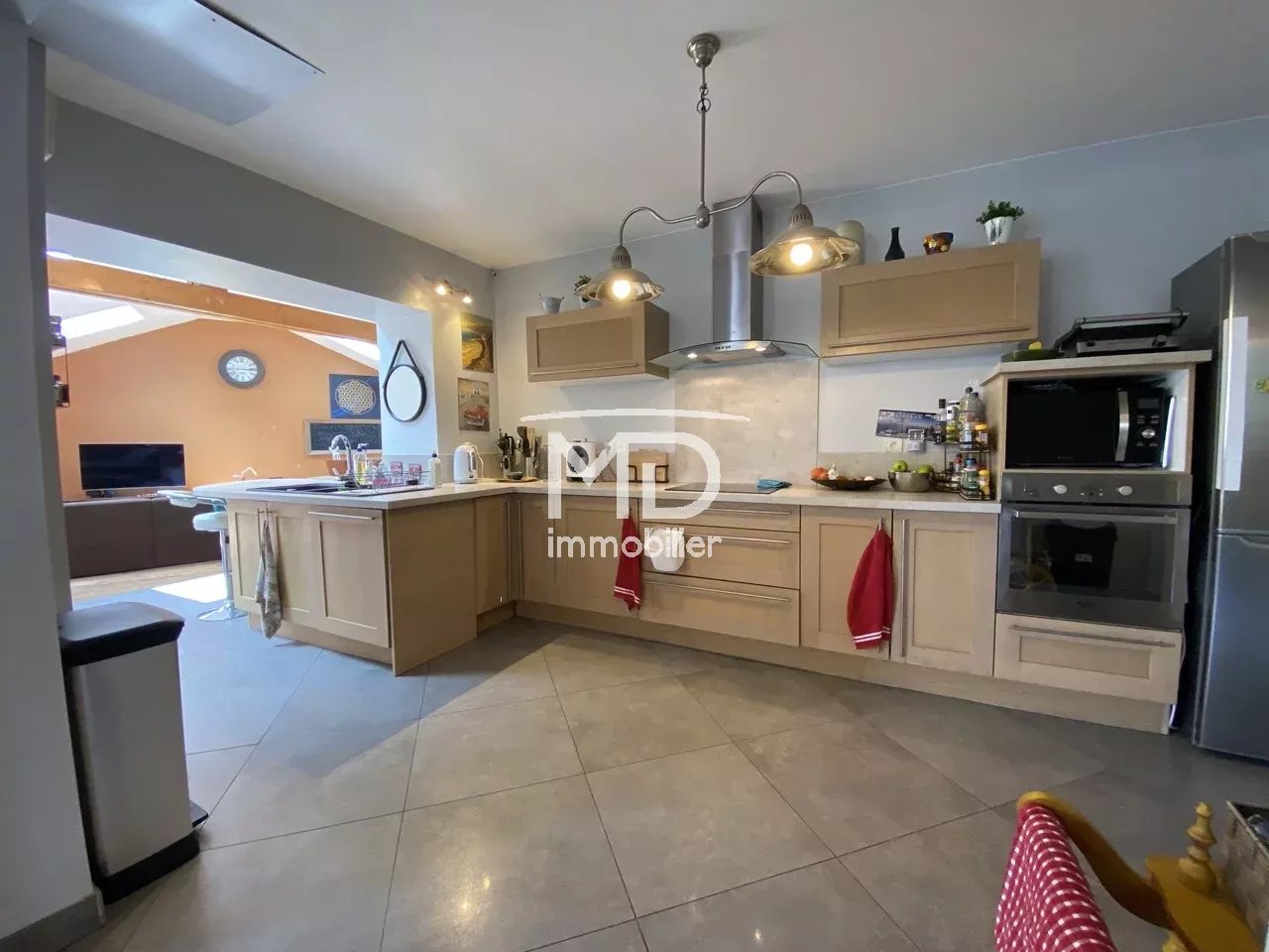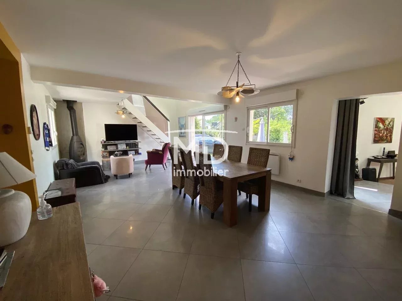 - Au rez-de-chaussée : hall d'entrée avec placard, WC, salle à manger de 38m² avec poêle à bois, accès terrasse, cuisine aménagée et équipée, salon de 70m² avec baies virées sur terrasse et jardin, chambre.