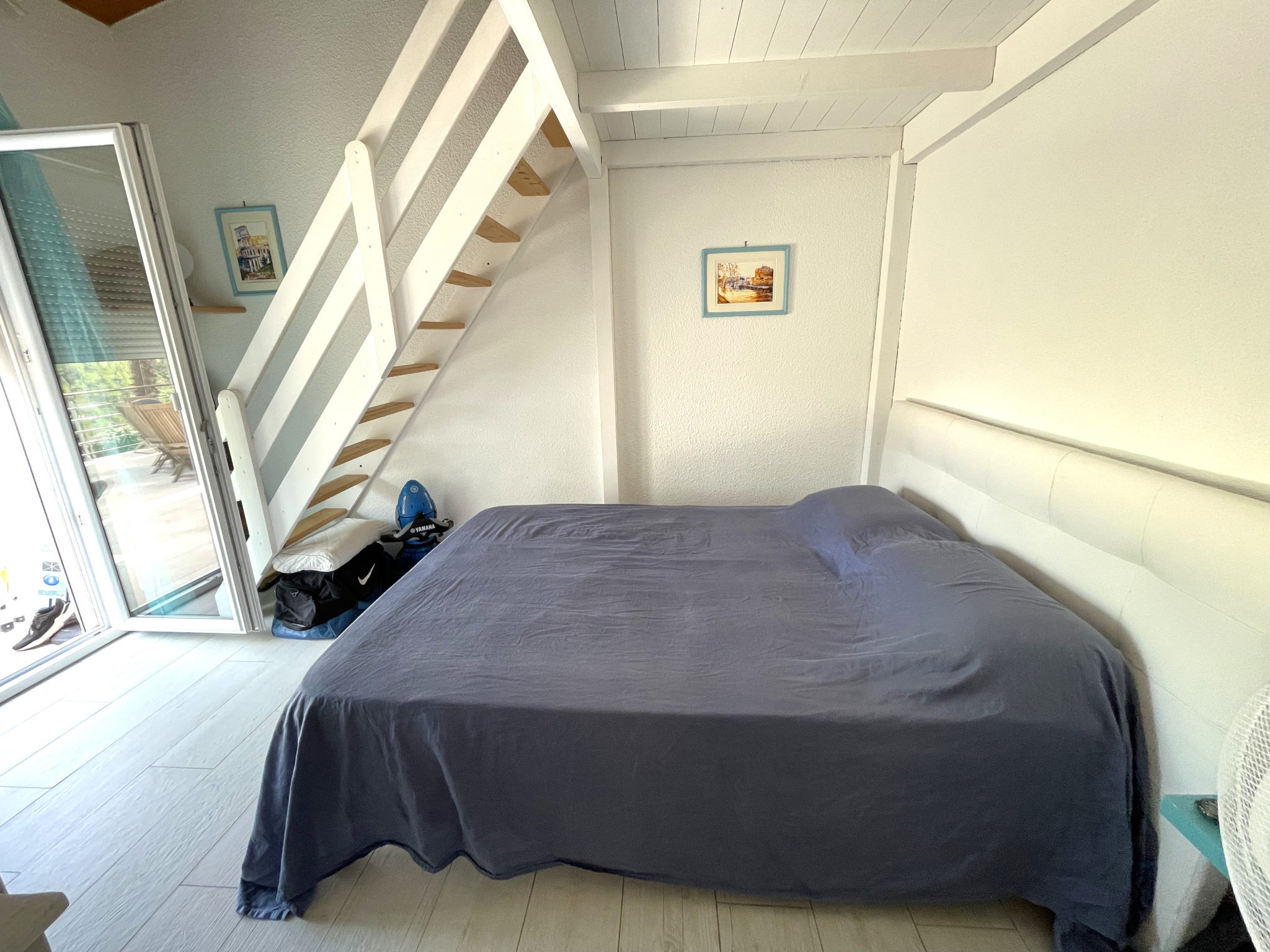 d'une chambre avec une belle hauteur sous plafond, elle aussi équipée d'une mezzanine de couchage, ainsi que d'une salle de bain récemment rénovée avec WC intégrés.