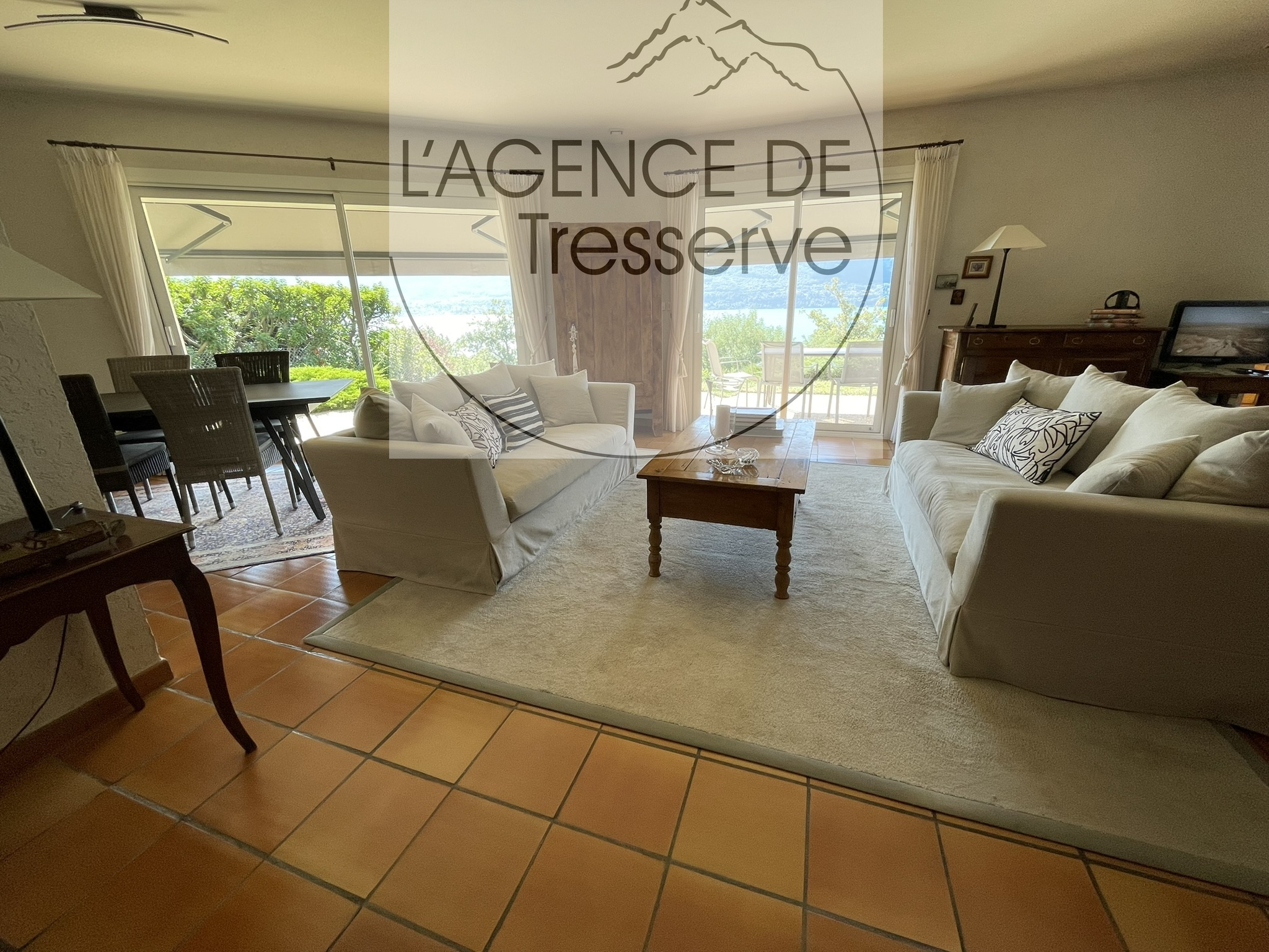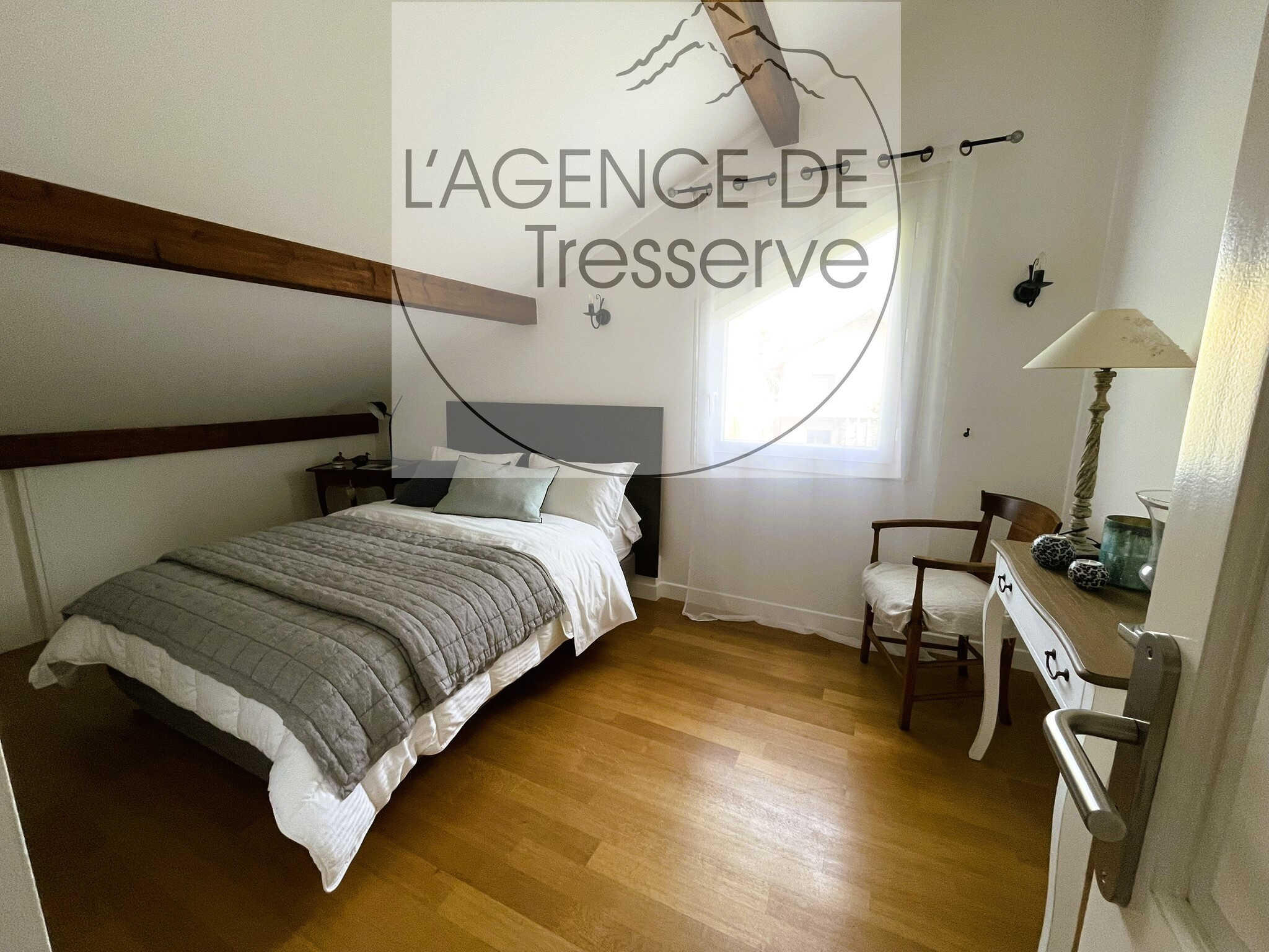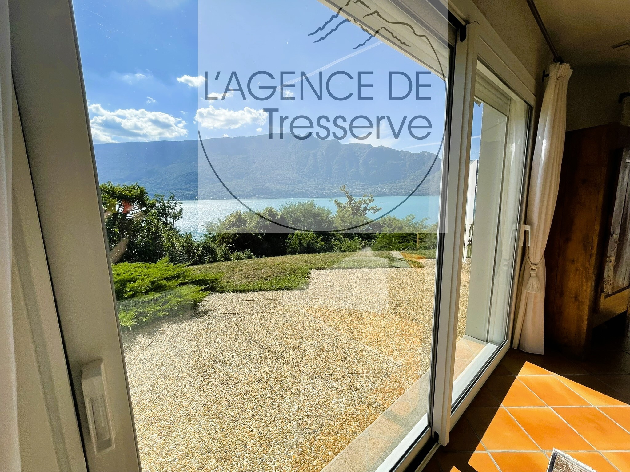 EXCLUSIVITE - Une vue très dégagée sur le Lac du Bourget, pour cette maison située à TRESSERVE. Construite en 1984 par ses propriétaires, elle se compose, au rez de chaussée d'une entrée, un séjour-salle à manger donnant sur terrasse, cuisine ouverte sur le salon, cellier, deux chambres, salle de bains et wc. A l'étage, deux chambres dont une très mansardée (environ 5,60m2 en loi carrez), salle d'eau avec wc, dressing et buanderie. Garage avec porte automatique. Le tout sur un beau terrain de 1321m2, arboré.