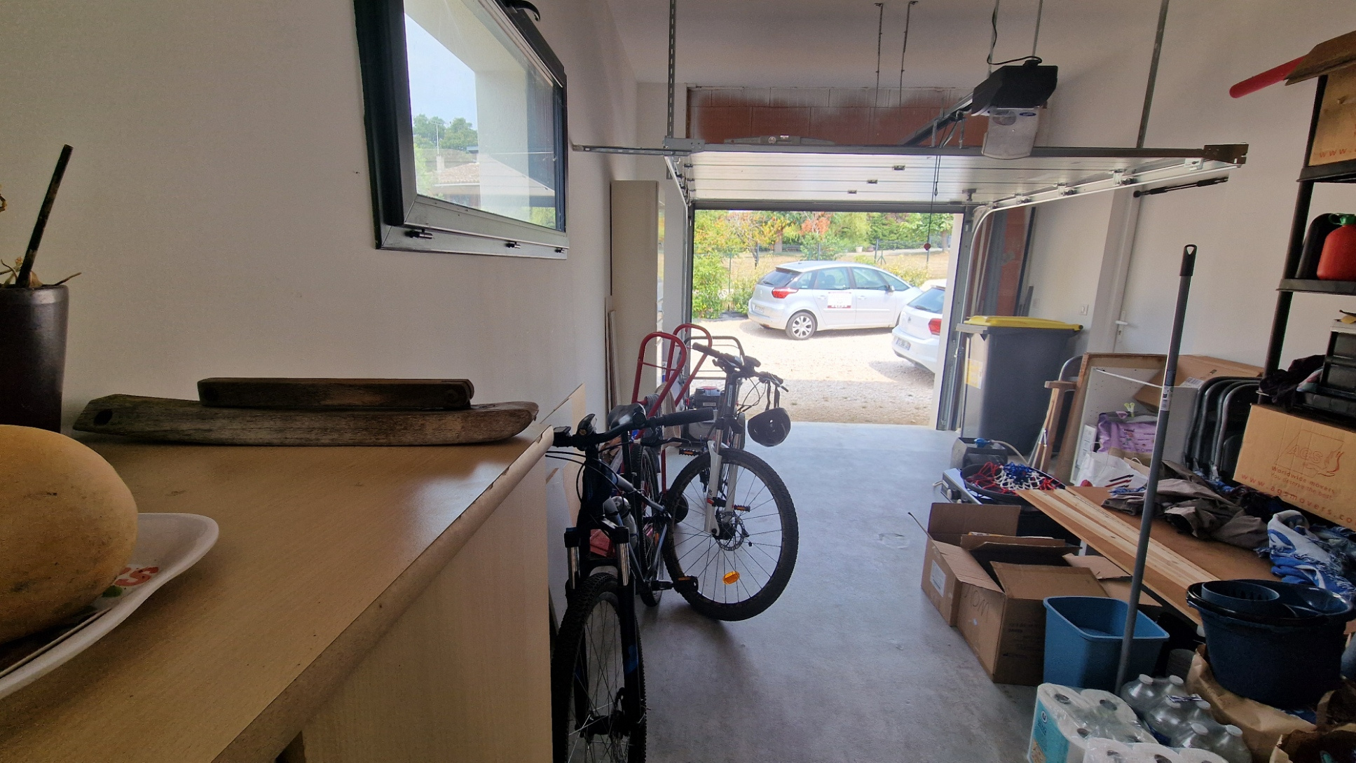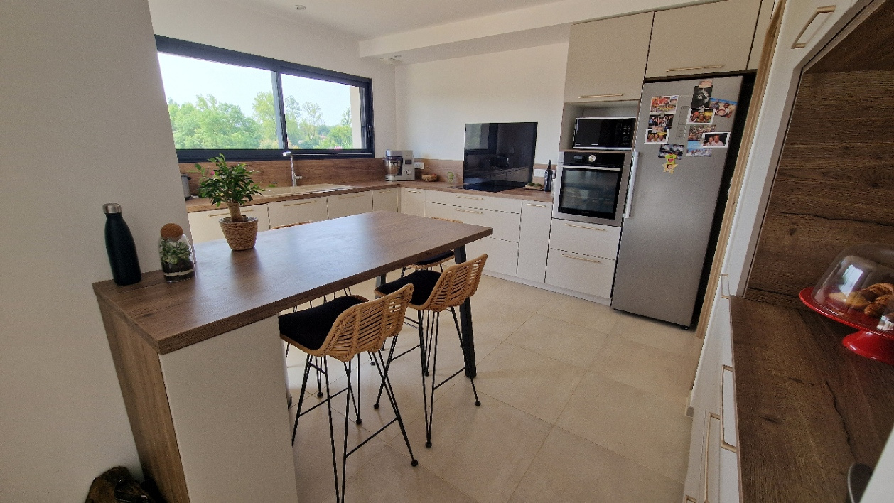 Elle est ouverte sur la cuisine (13 m2) qui dessert directement la 2e terrasse (11 m2) protégée par sa pergola bioclimatique (avec lames inclinables par télécommande) d'un côté, de l'autre sur le grand garage ou atelier (19,6 m2).