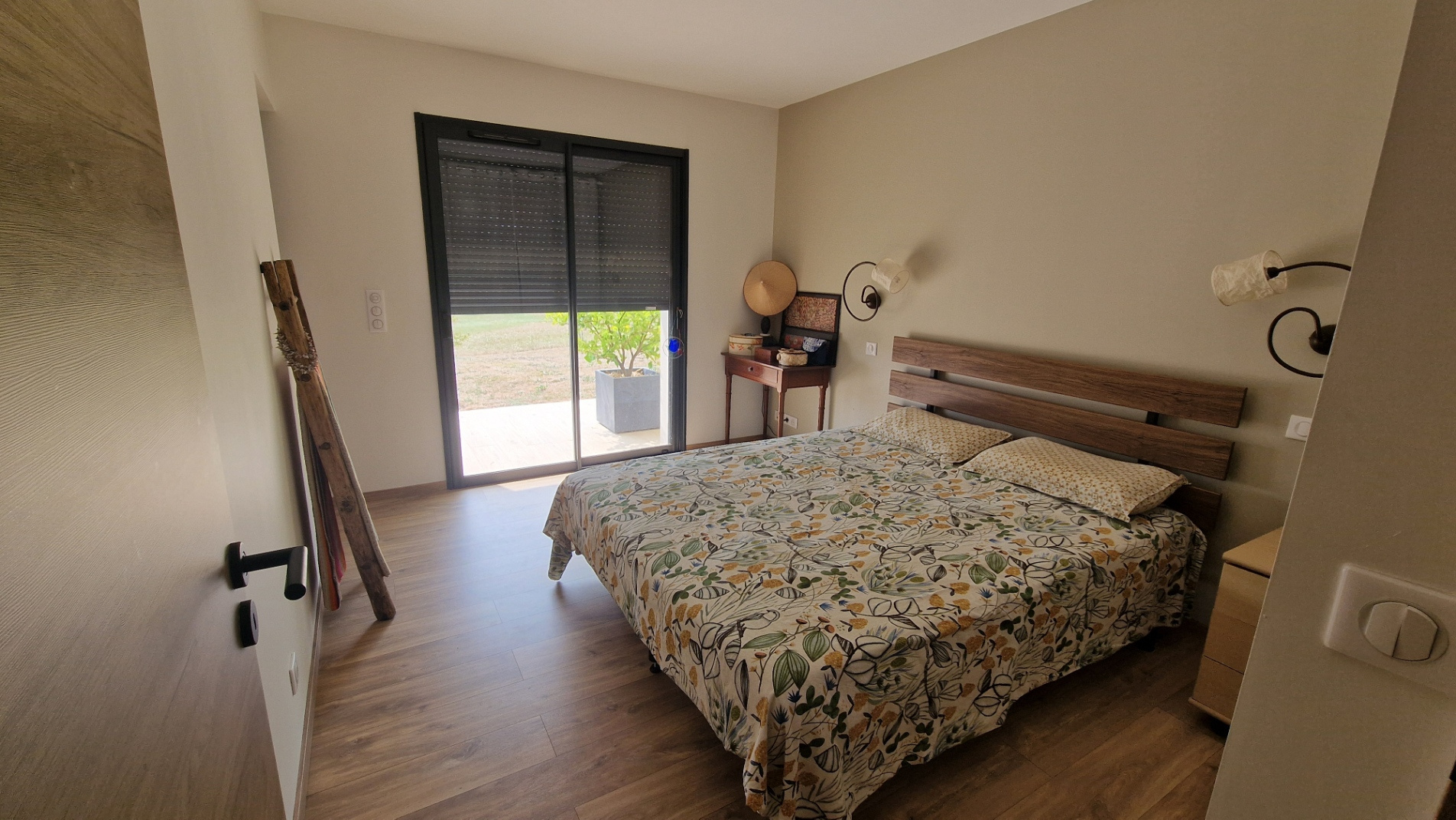 C'est l'isolation écologique performante (fibre de bois et laine de coton), les menuiseries alu brossées double vitrage partout avec volets électriques intégrés, et l'exposition plein sud avec ses ouvertures royales (a galandage), qui font la différence.