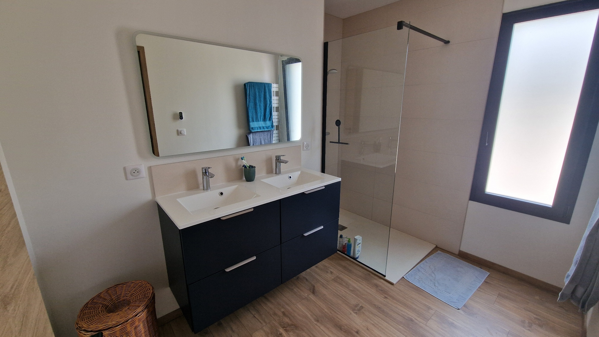 Une salle d'eau pour les deux autres chambres (11 m2 chacun) avec double vasque et douche à l'Italienne, des WC indépendantes confortable avec lave- mains.