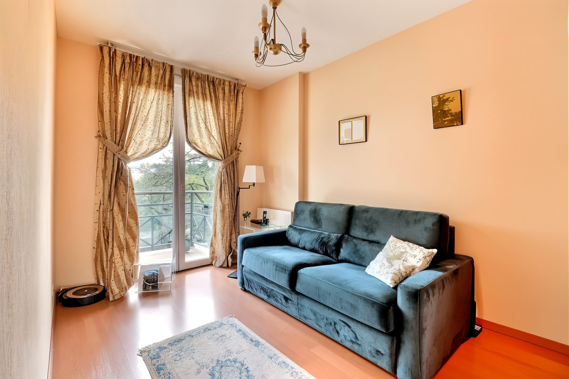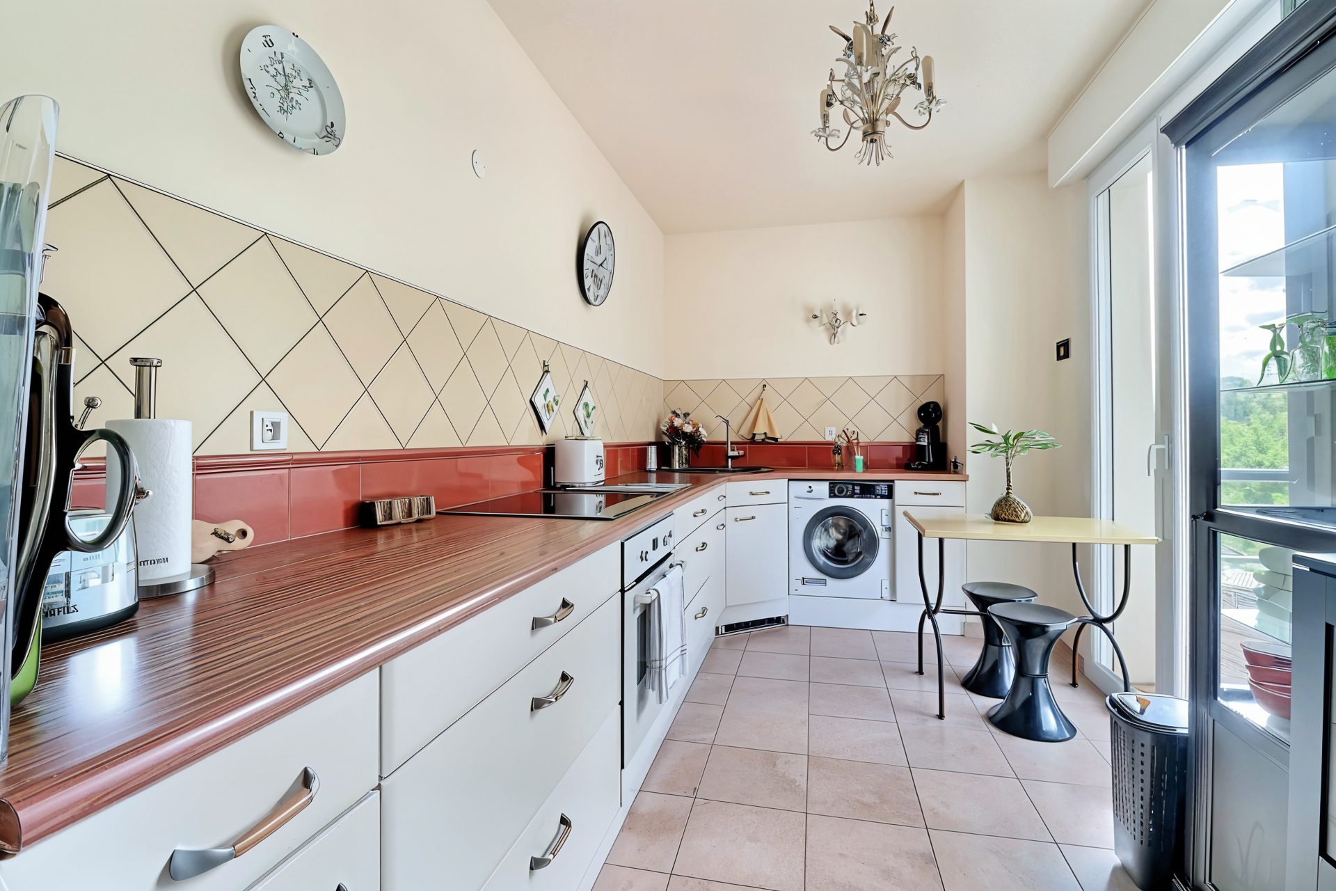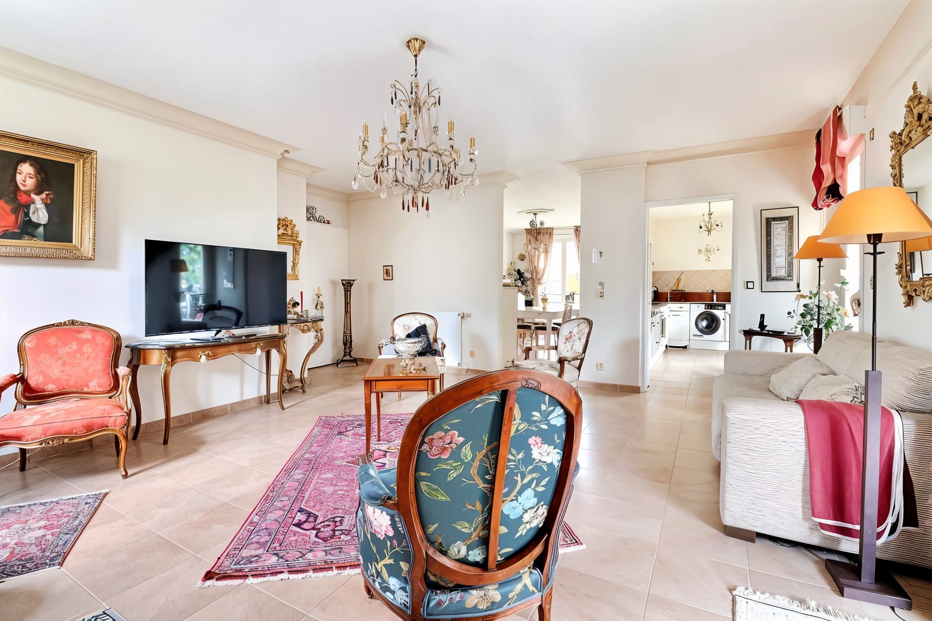 La pièce de vie, spacieuse et baignée de lumière, se compose d'un salon et d'une salle à manger ouvrant sur une superbe terrasse plein sud, offrant une vue dégagée sur le parc arboré de la résidence. La cuisine attenante, fonctionnelle, bénéficie elle aussi d'un accès direct à l'extérieur, invitant à profiter pleinement des beaux jours.