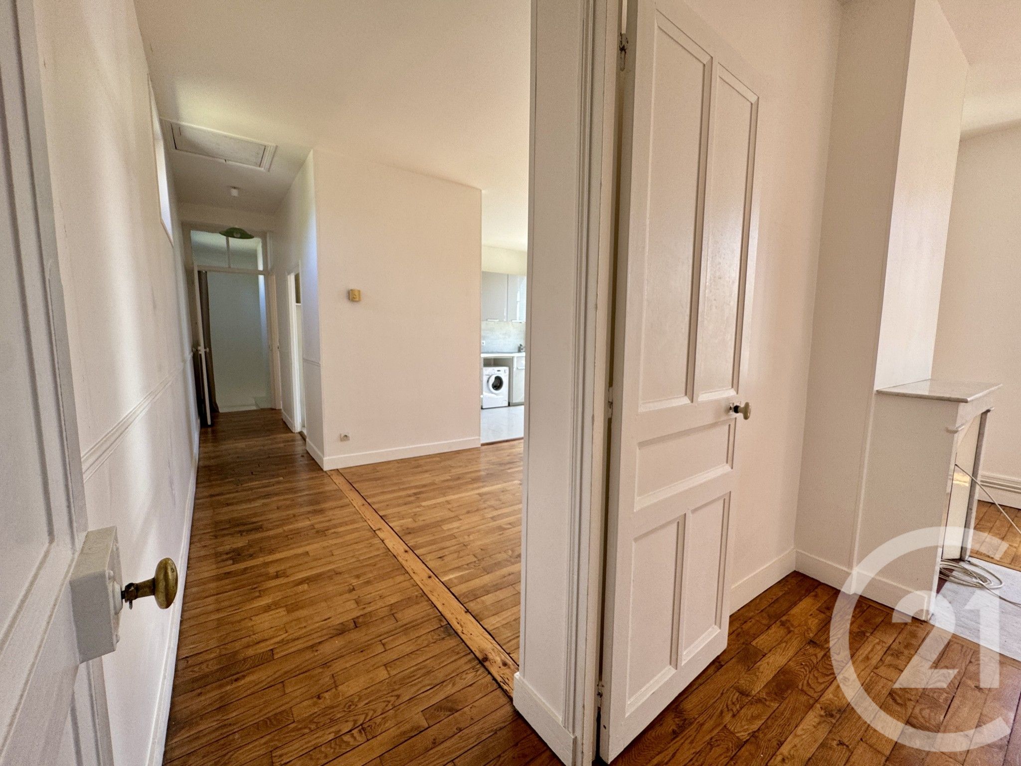 Le dégagement dessert deux chambres en parquet avec cheminées décoratives une cuisine aménagée ouverte sur un séjour en parquet et une salle de bains avec wc .