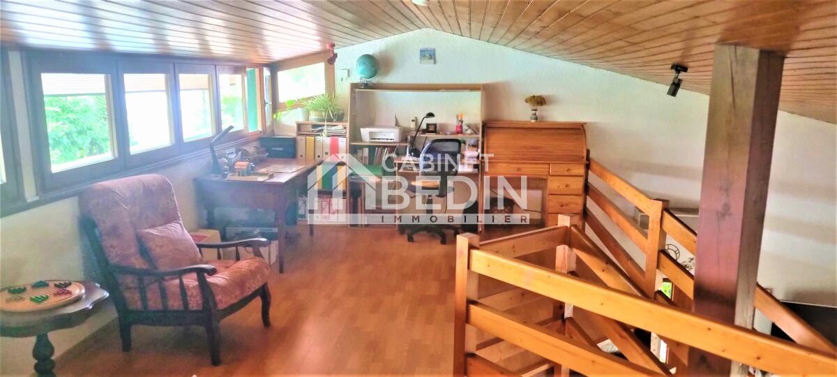 À l'étage, une mezzanine polyvalente, idéale pour un bureau ou un espace de jeux, un coin nuit avec dressing et point d'eau complètent ce niveau.