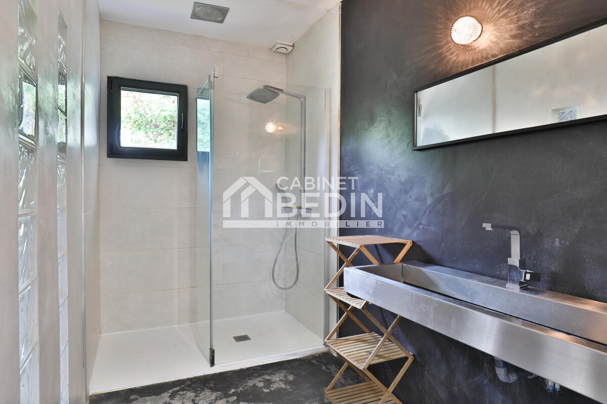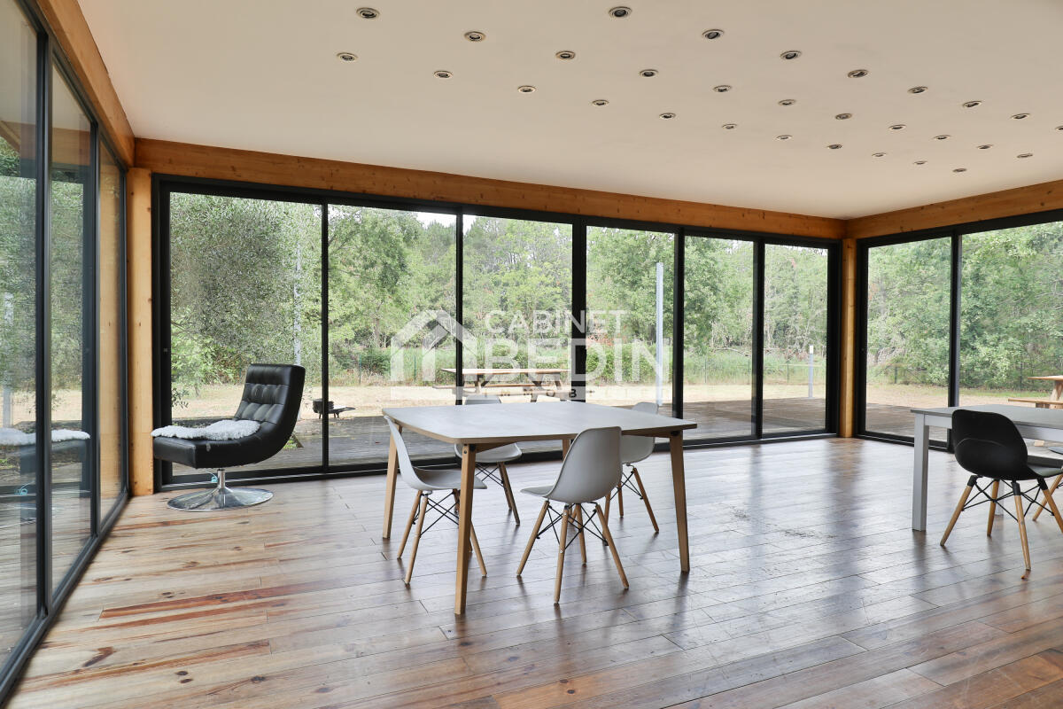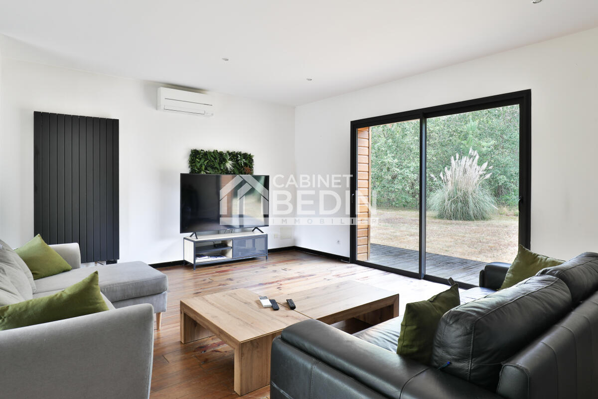Exclusivité CABINET BEDIN - SANGUINET PROCHE LAC. Dans un cadre privilégié, au calme proche des plages et port du lac, cette superbe maison séduit par son environnement verdoyant avec son vaste terrain de plus de 2000m² en lisière de forêt. Dés l?entrée, vous serez charmé par ses grands espaces baignés de lumière : un vaste séjour/salle à manger avec triple exposition, une cuisine ouverte moderne et un salon confortable offrant une atmosphère conviviale. Son parquet massif apporte chaleur et caractère à l?ensemble. Côté nuit, la maison propose en rez-de-chaussée deux chambres avec dressing et une salle d?eau. A l?étage, une grande pièce transformée à terme en chambre supplémentaire avec dressing et salle d'eau. Bien rare alliant confort, luminosité et qualité de vie. A découvrir sans tarder.