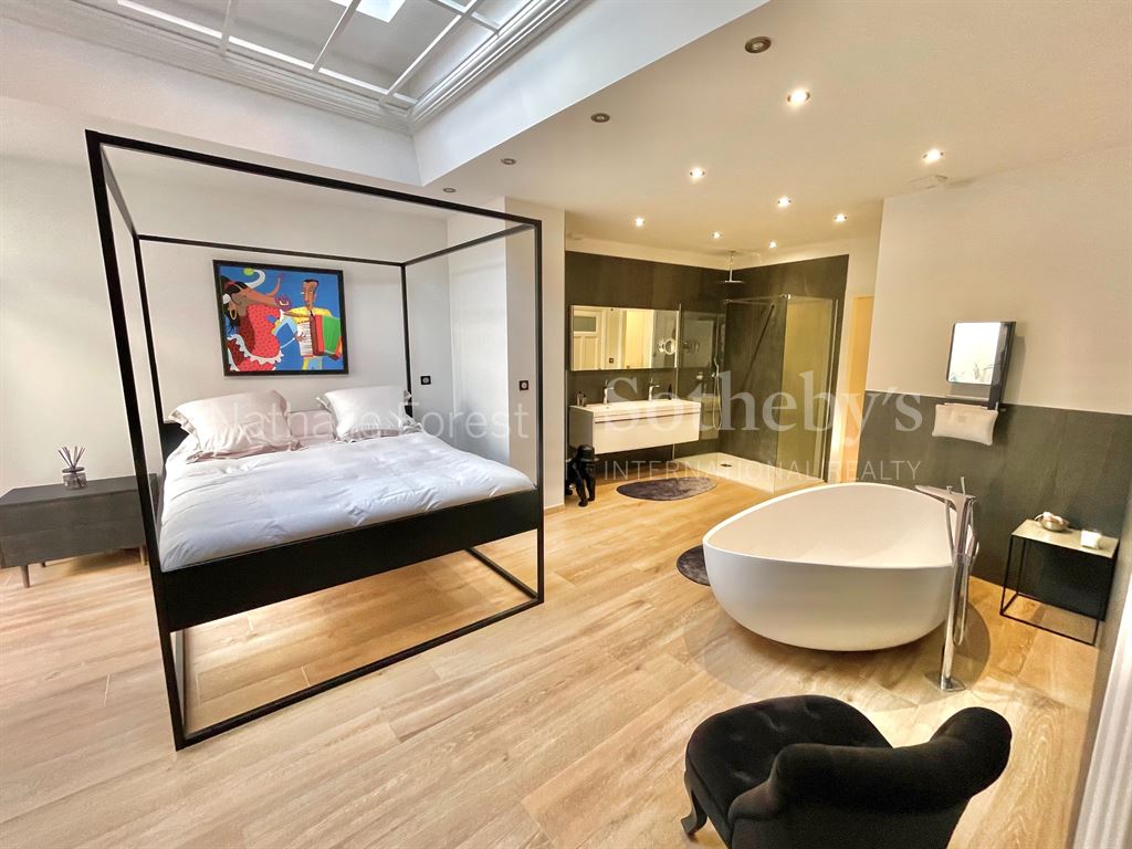 À l’étage, vous trouverez un spacieux palier offrant un coin bibliothèque et bureau, un grand dressing, une salle de bains ainsi qu’une chambre (actuellement bureau). Le deuxième et dernier étage accueille deux magnifiques suites parentales, chacune bénéficiant d’un accès indépendant, d’une salle de bains privative et de très beaux volumes.