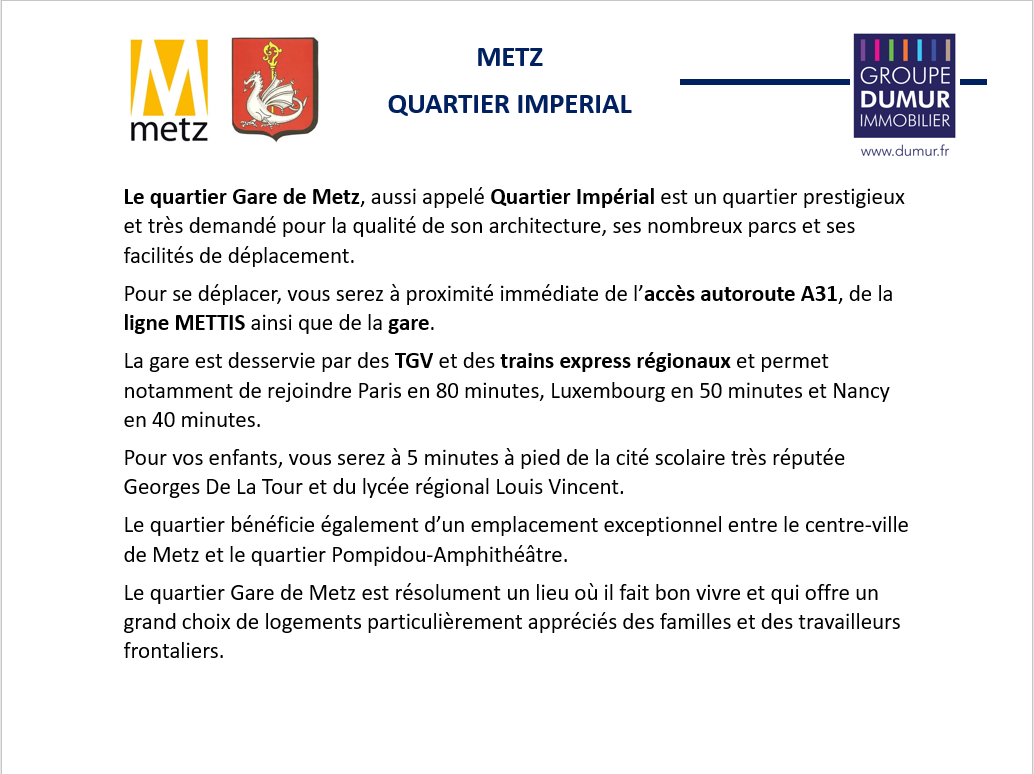 Metz Quartier Impérial : Dans ce quartier prestigieux avec ses nombreux commerces de qualité et son architecture remarquable ! Vous bénéficierez d'un emplacement exceptionnel pour cet appartement situé à 5 minutes à pied de la gare, dépendant des meilleurs établissements scolaires et à 2 minutes de l'embranchement d'autoroute.