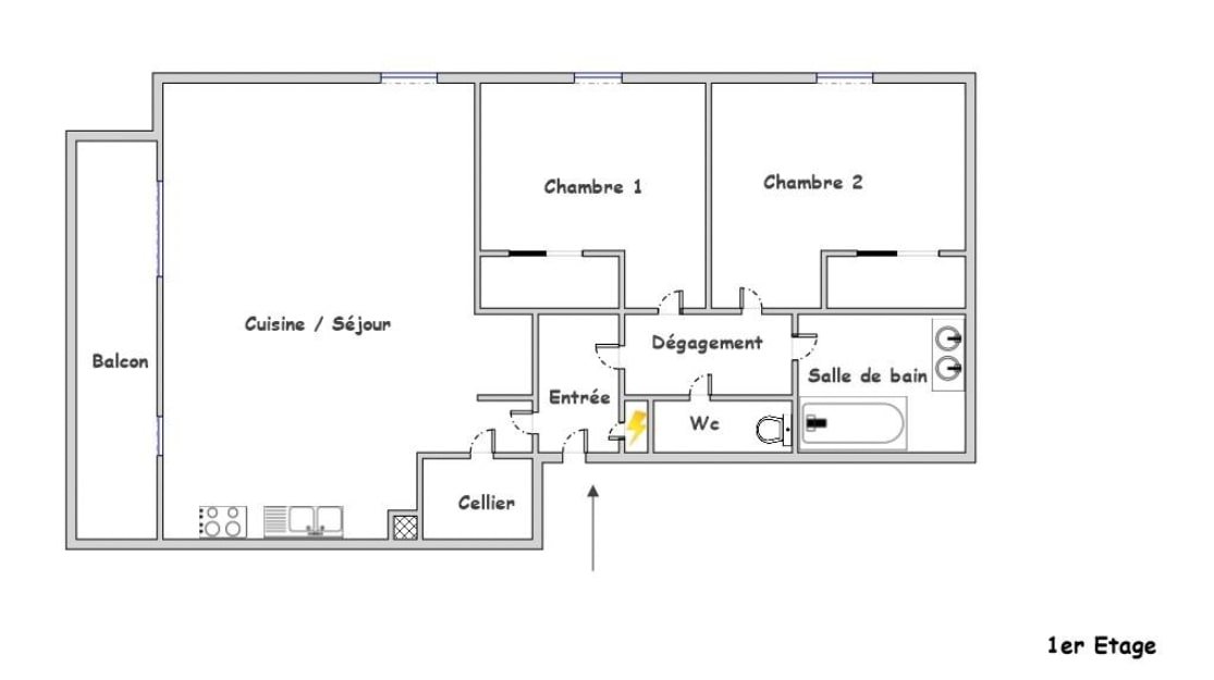 Il se compose d'une entrée, une pièce de vie lumineuse de 37m2, 2 chambres, une salle de bains et un WC indépendant.