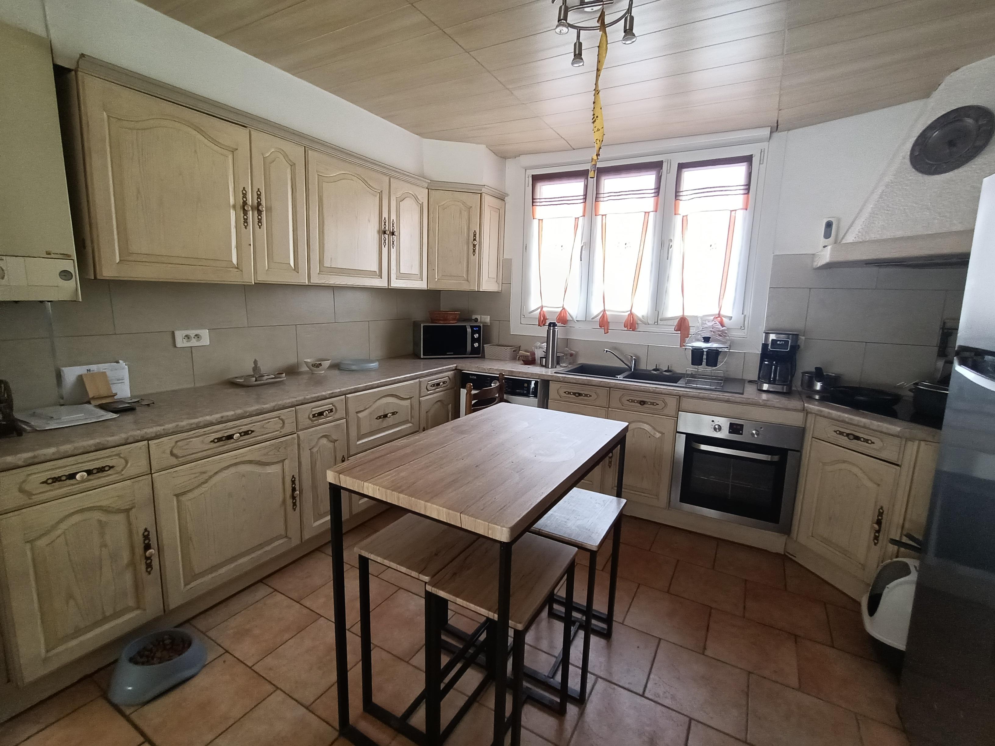 AU RDC , hall d'entrée ,cuisine ouverte sur séjour + 38m²avec poele à pellets , WC.