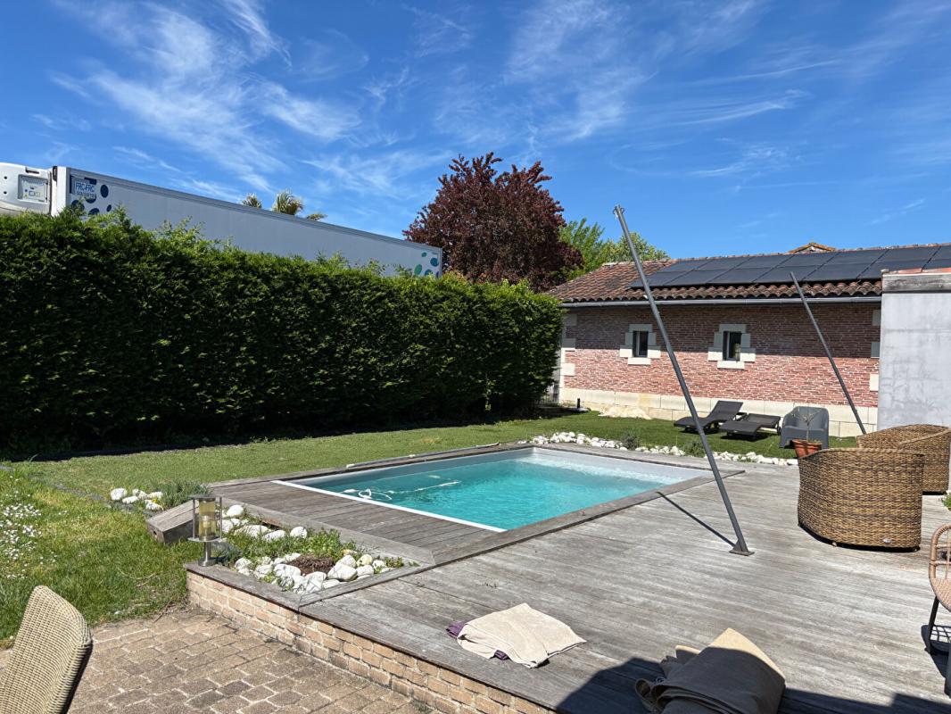 Ancien domaine viticole, situé au calme en plein coeur du Médoc, et ayant conservé tout le charme des prestations anciennes, comme la hauteur sous plafond, les parquets en chevrons, les carreaux de ciment, les murs en pierre, il se compose pour la partie principale de d'un double salon, d'une grande cuisine donnant sur une petite piscine, d'un grand bureau et de 4 grandes chambres.