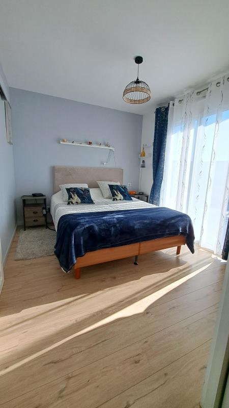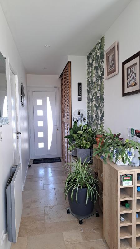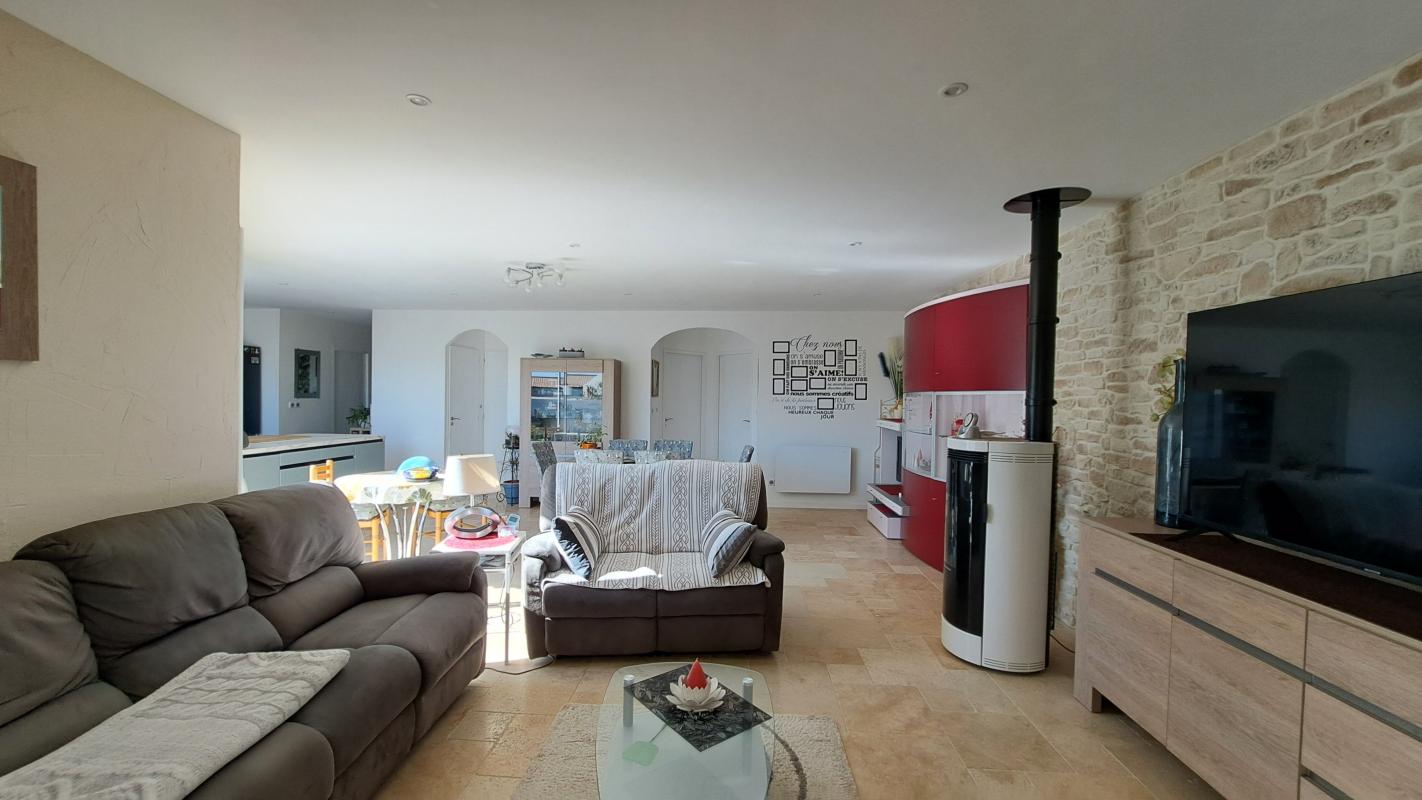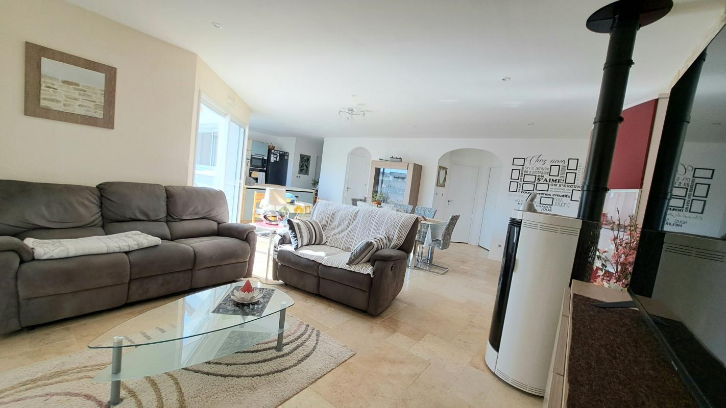 Dès l'entrée, un placard intégré ouvre sur une pièce de vie lumineuse d'environ 46,5 m², chaleureusement décorée avec un poêle à -granulés, un mur en pierre apparente et un traversin au sol apportant une touche d'élégance.