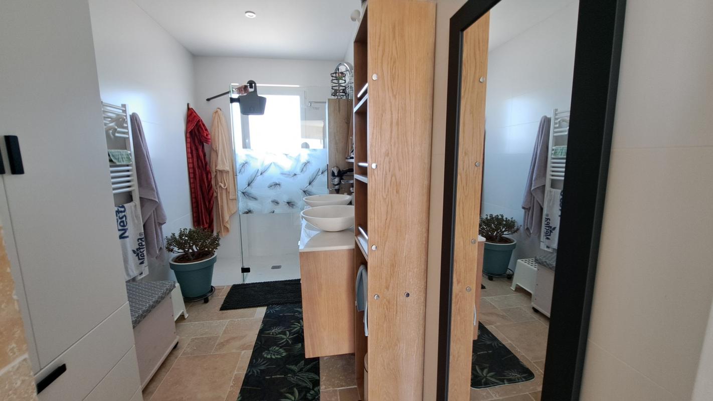 -Une salle d'eau moderne avec douche à l'italienne, double vasque et colonne de rangement,