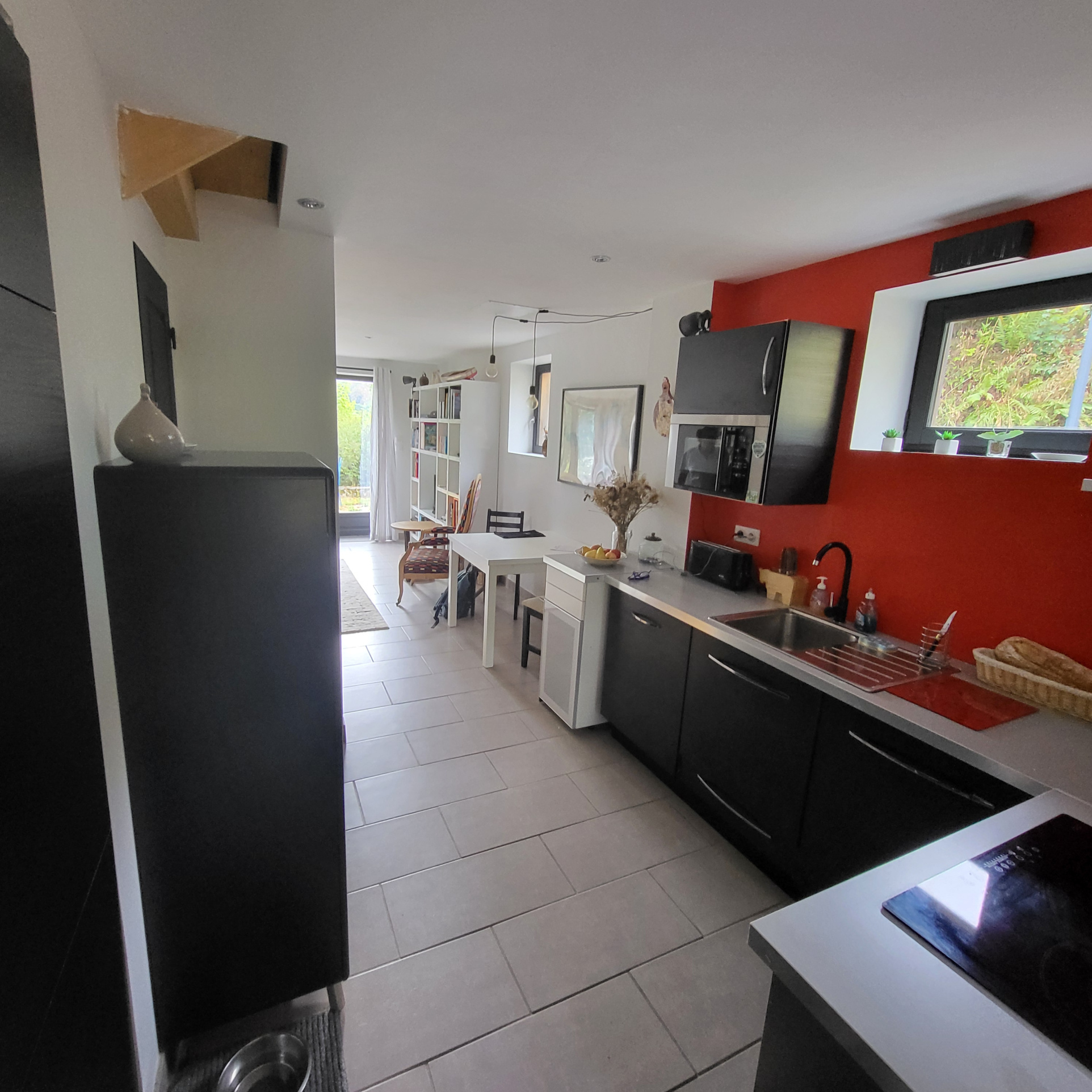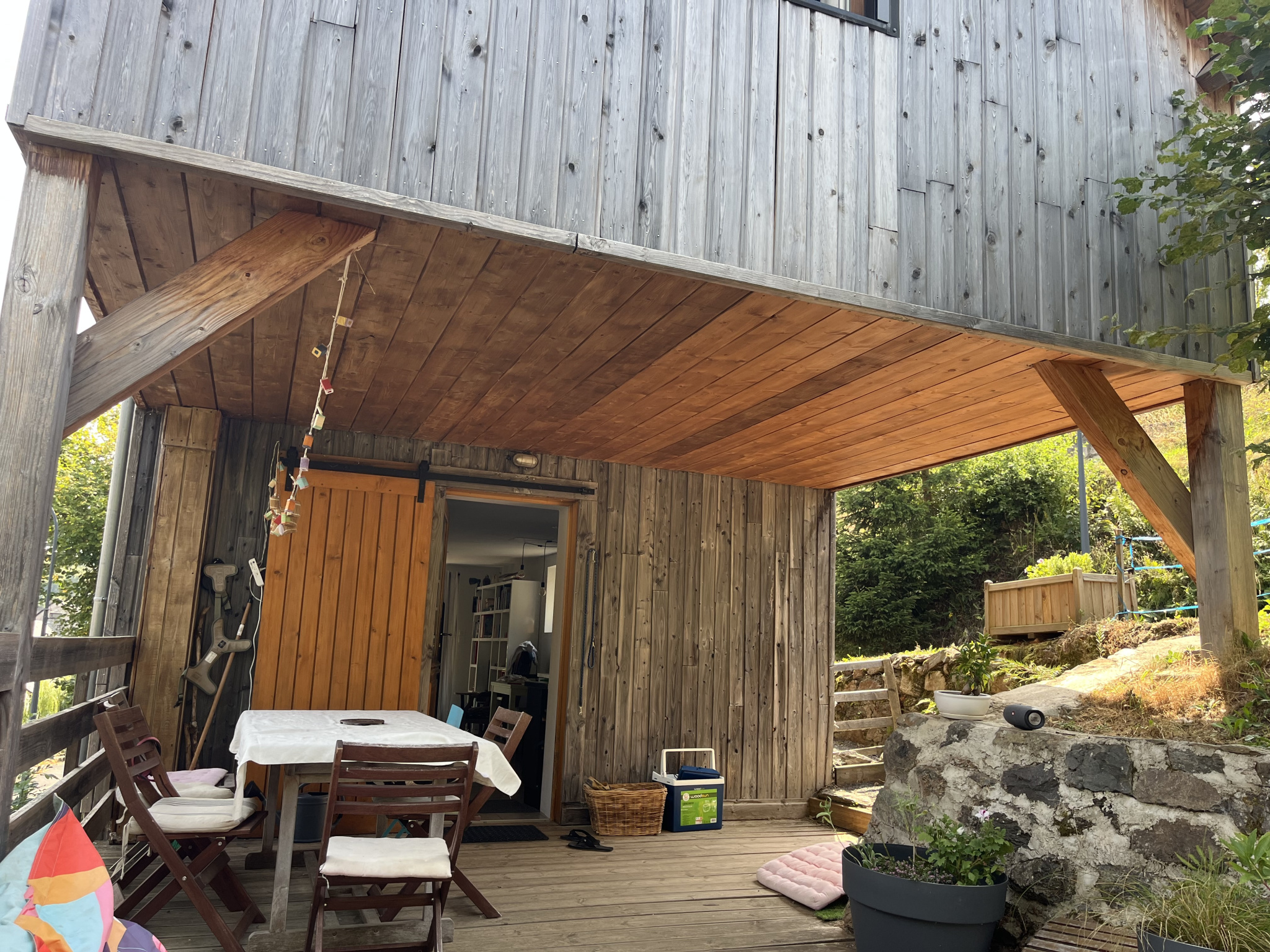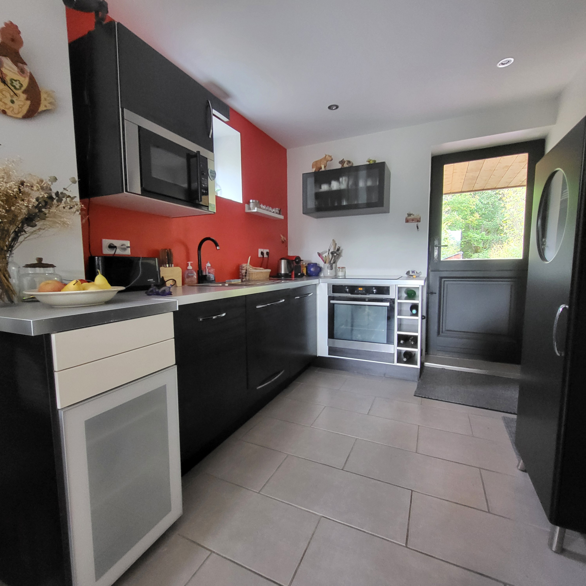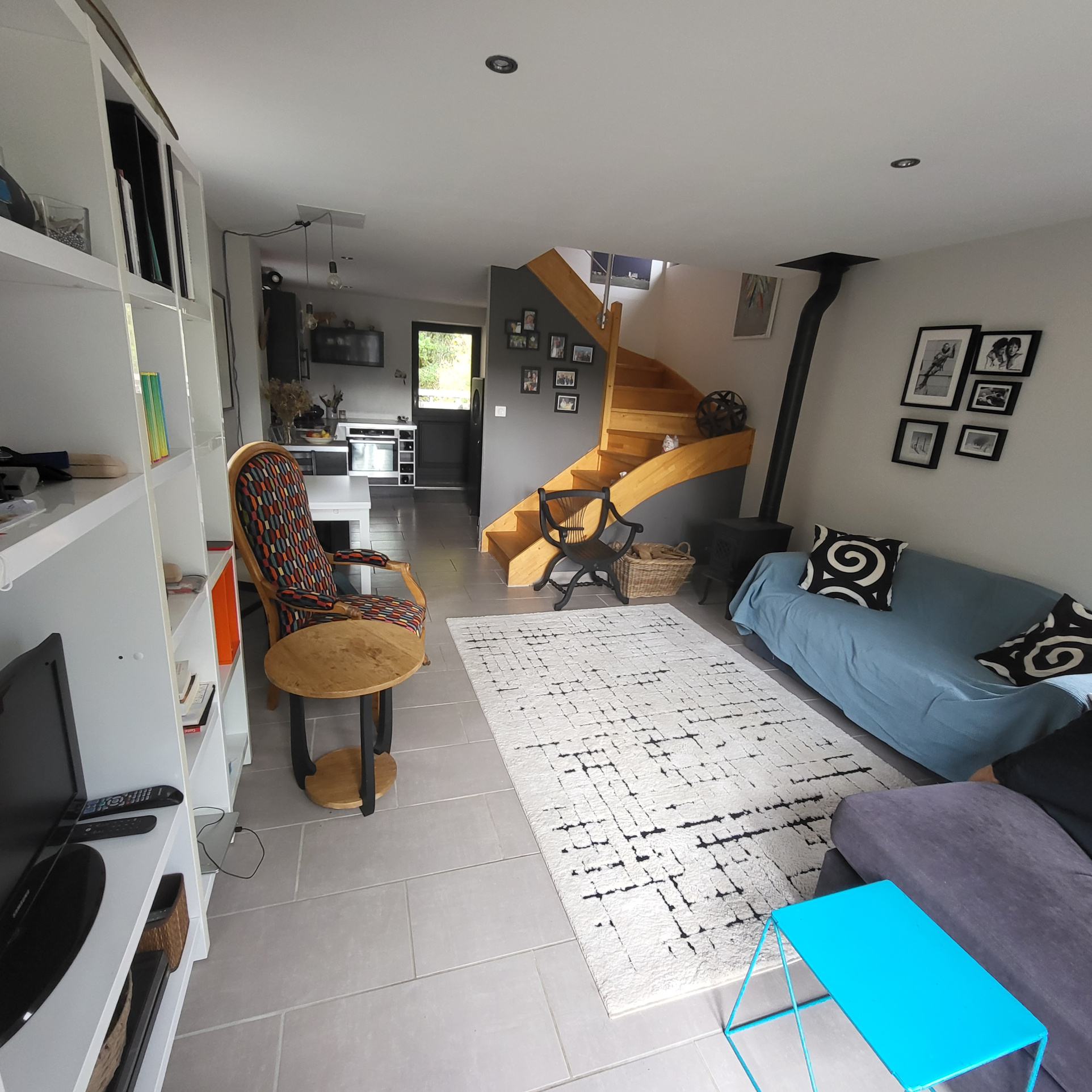 Double vitrage, chauffage poêle à bois et dalle chauffante (électrique). Elle est composée d'une piéce de vie avec cuisine équipée, accès terrasse en bois, buanderie/cellier.