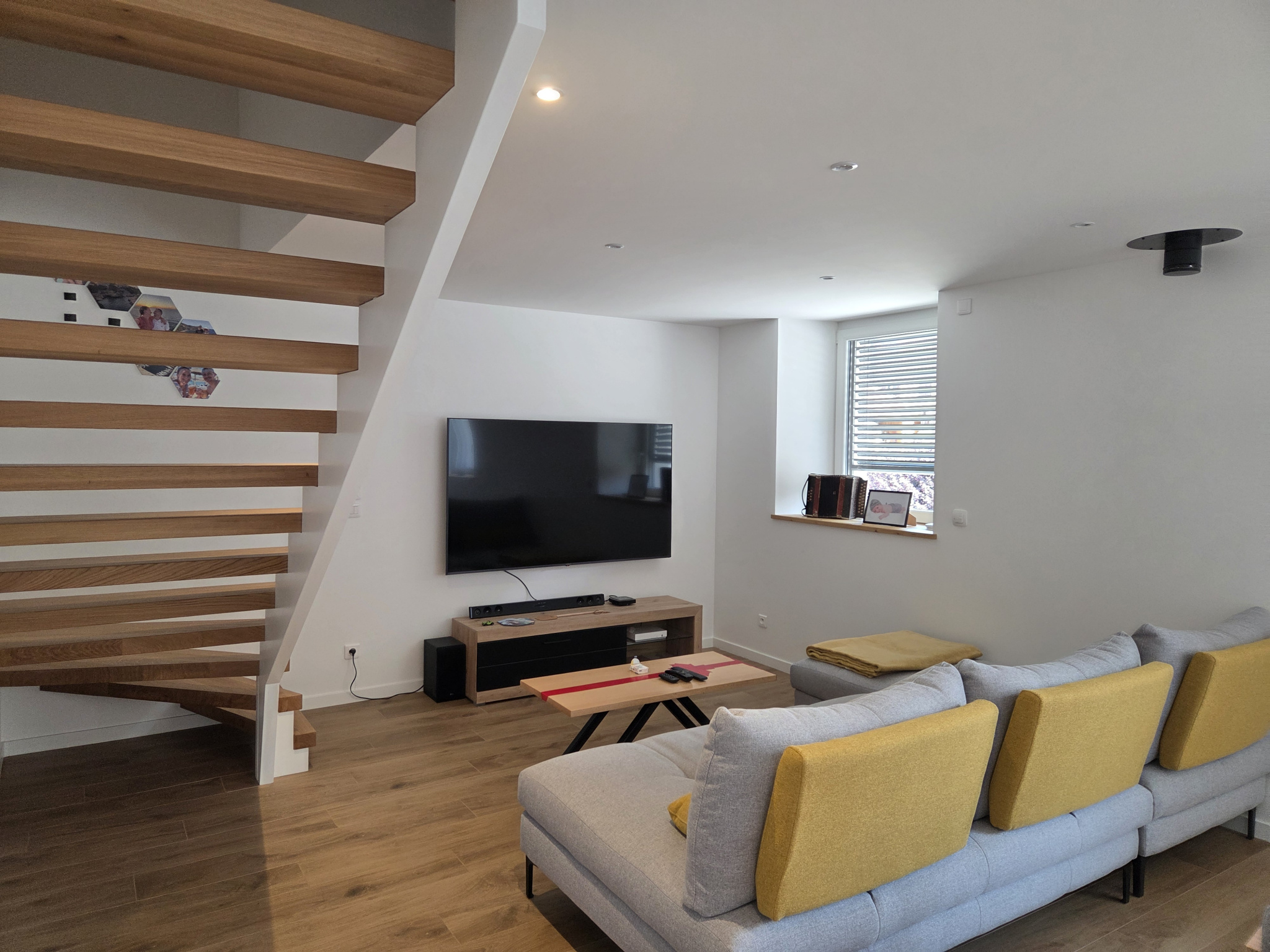 Le deuxième niveau offre deux chambres, un espace détente et une salle de bains moderne avec WC.