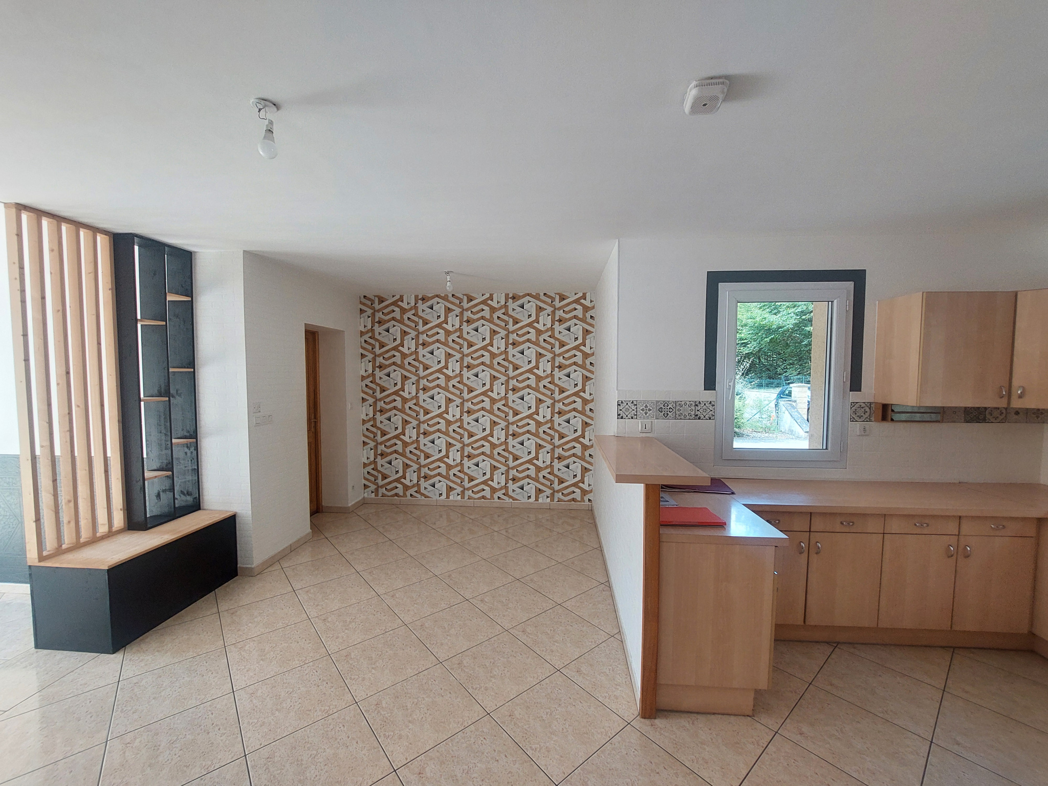 Séjour convivial ouvert sur une cuisine aménagée et équipée