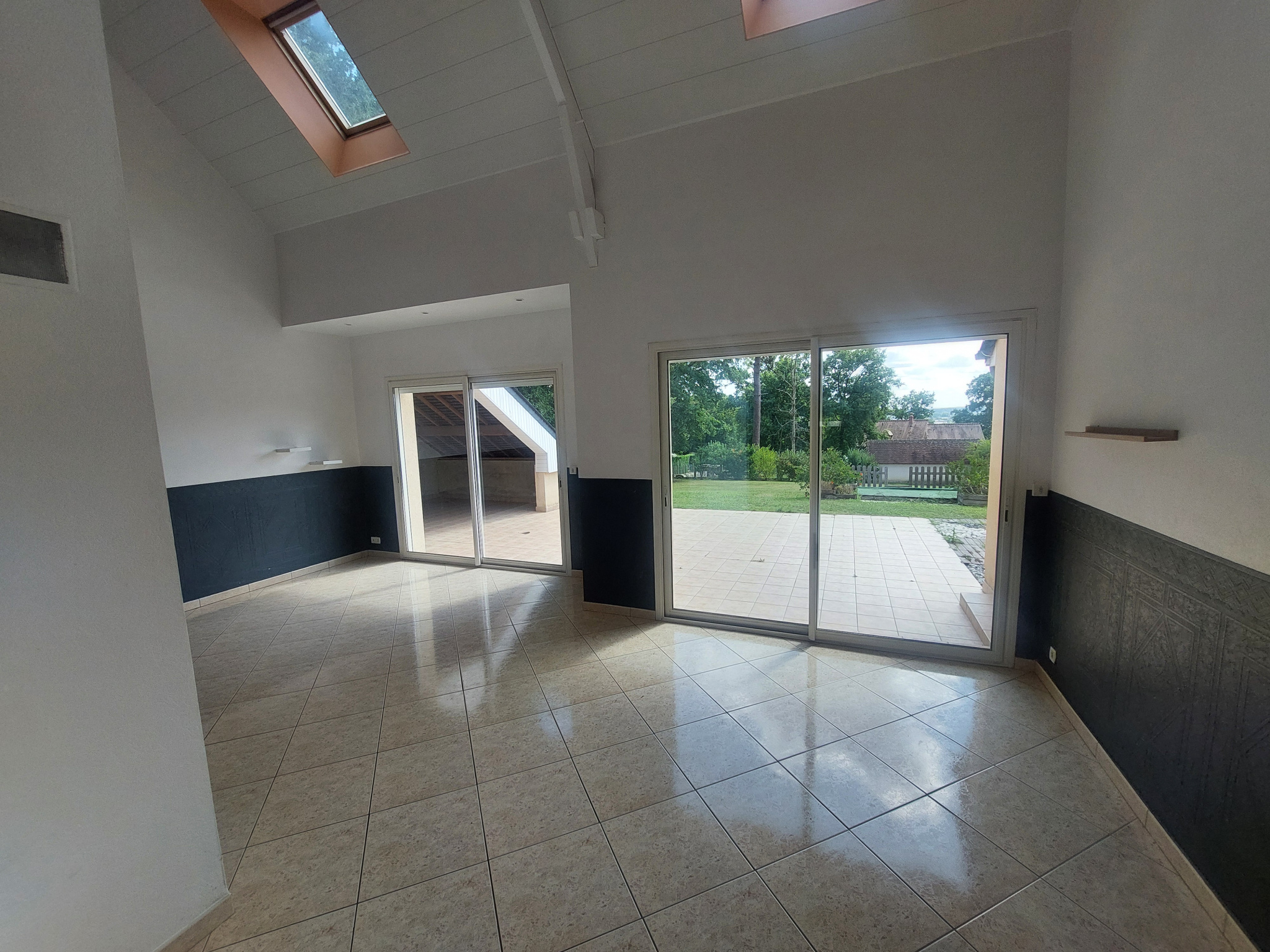 Salon lumineux avec cheminée insert, ouvrant directement sur le jardin