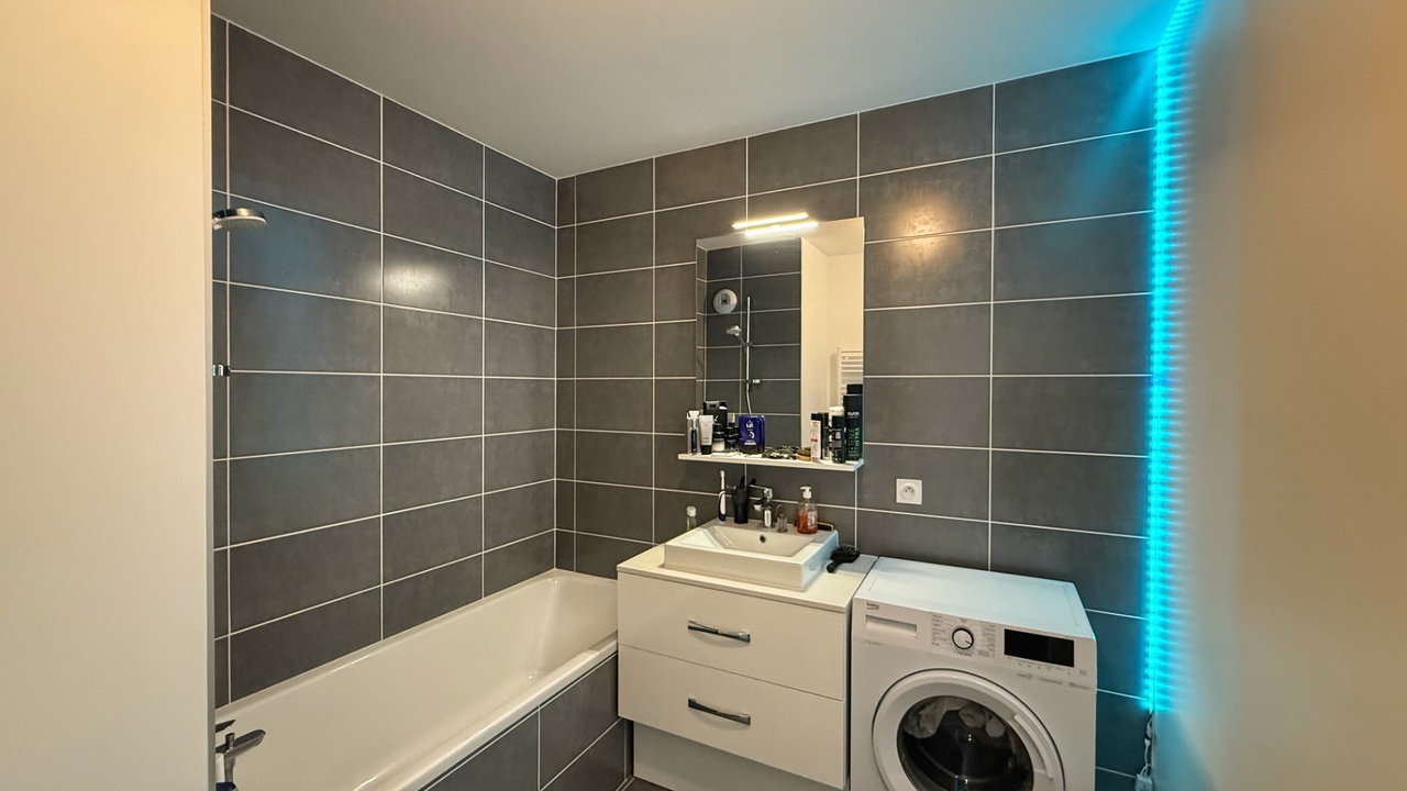 L'appartement se compose d’une entrée avec placard mural, d’une pièce de vie de 30,56 m² ouverte sur une cuisine équipée (four, plaque induction, hotte et lave-vaisselles) offrant un accès à la terrasse carrelée de 8,70 m², d’1 chambre de 11,70 m² avec dressing, d’une SDB ainsi que d’un WC indépendant.