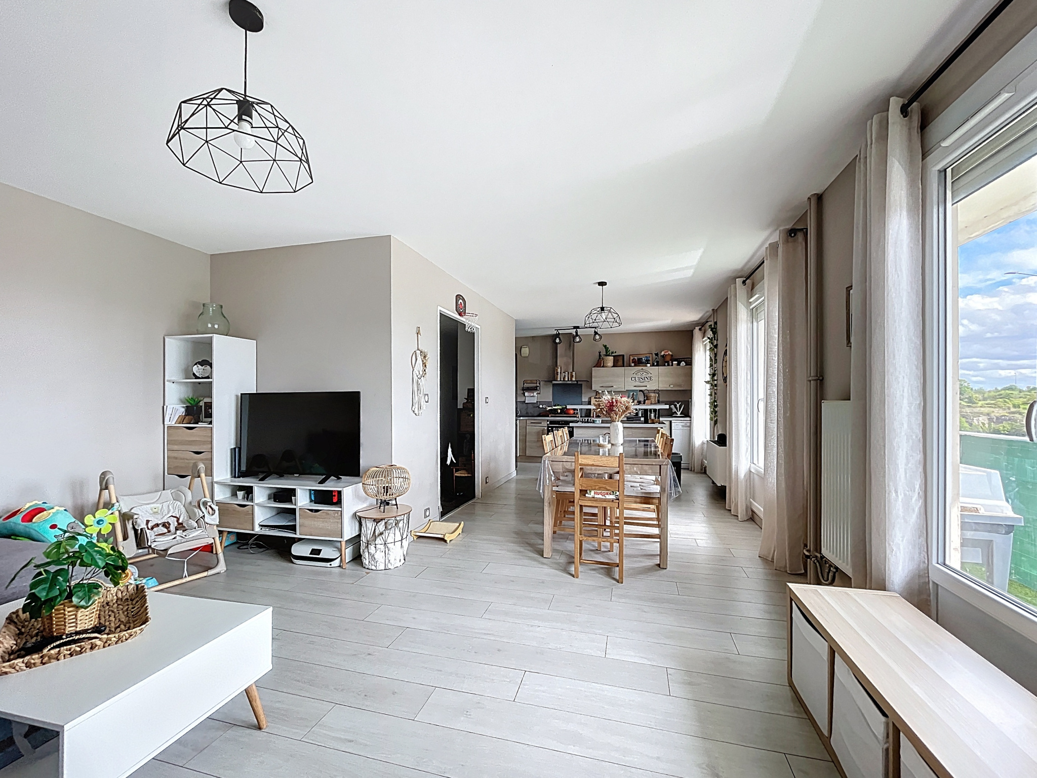 Appartement Type 5, en parfait état intérieur, d'une surface de 88.33 m2 situé au rdc surélevé, comprenant : un hall d'entrée avec placard, une salle de bains, un wc, une cuisine équipée donnant sur un salon séjour avec balcon, trois chambres, une cave en sous-sol.