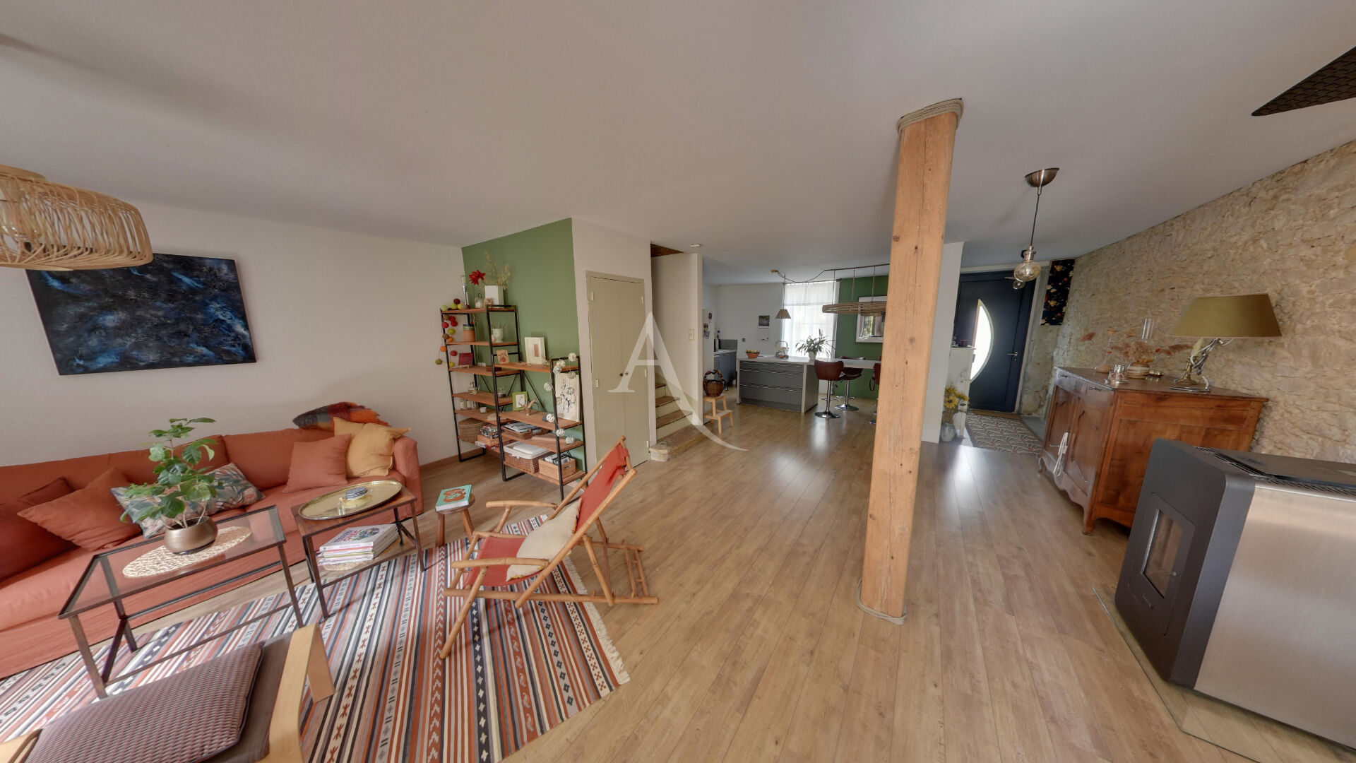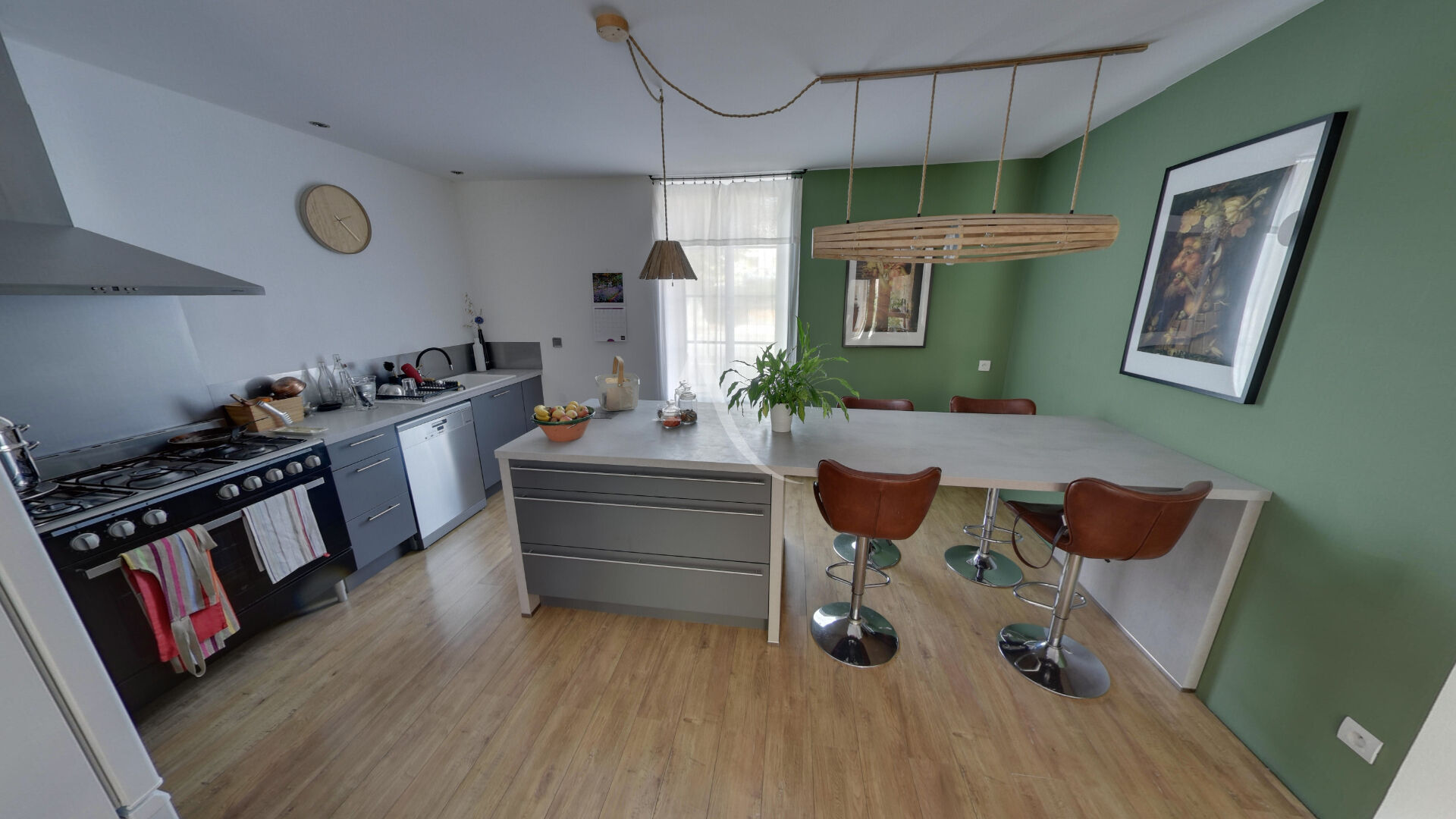 Au rez-de-chaussée : une spacieuse pièce de vie baignée de lumière, avec cuisine ouverte donnant accès directement au jardin.