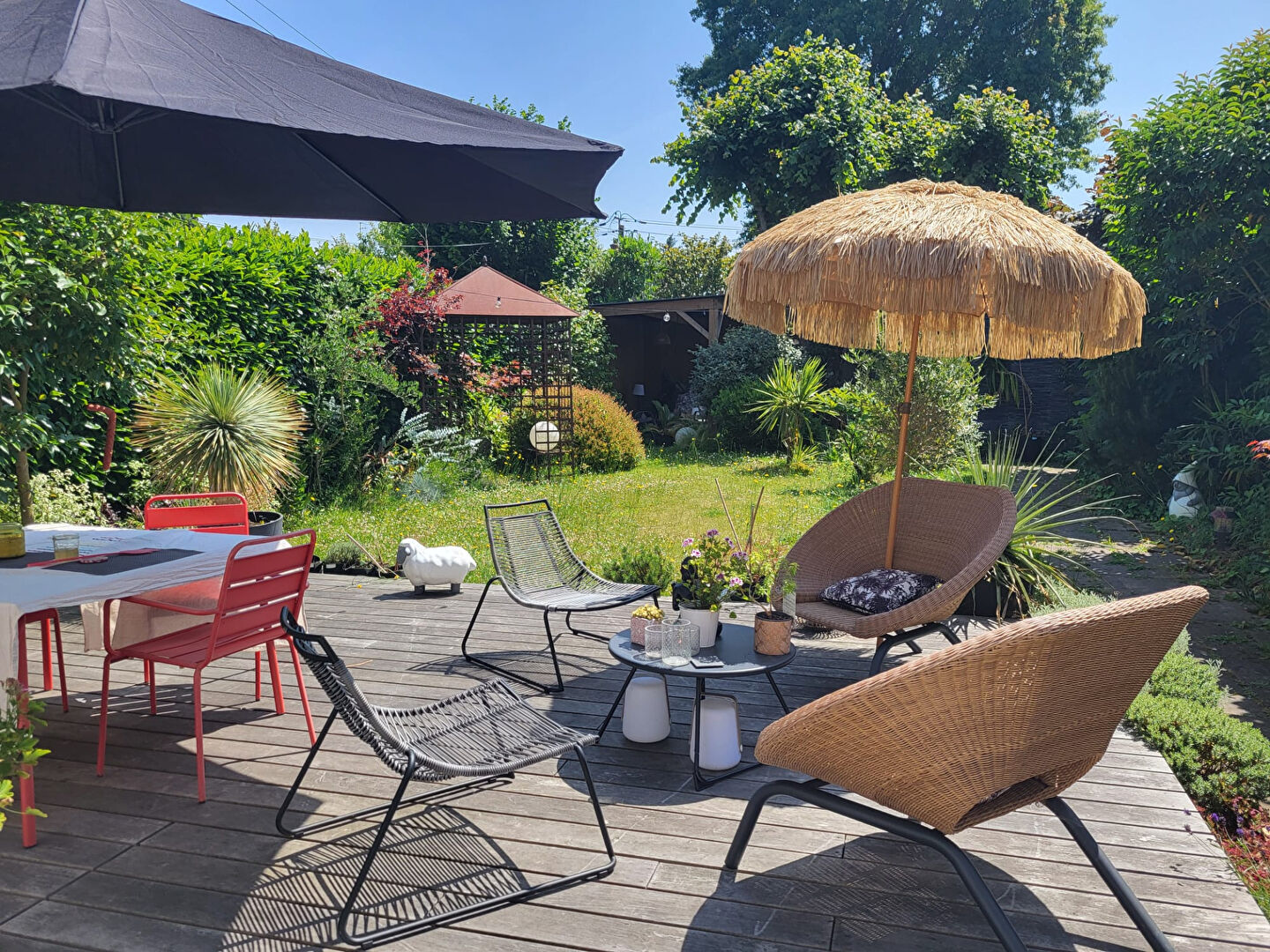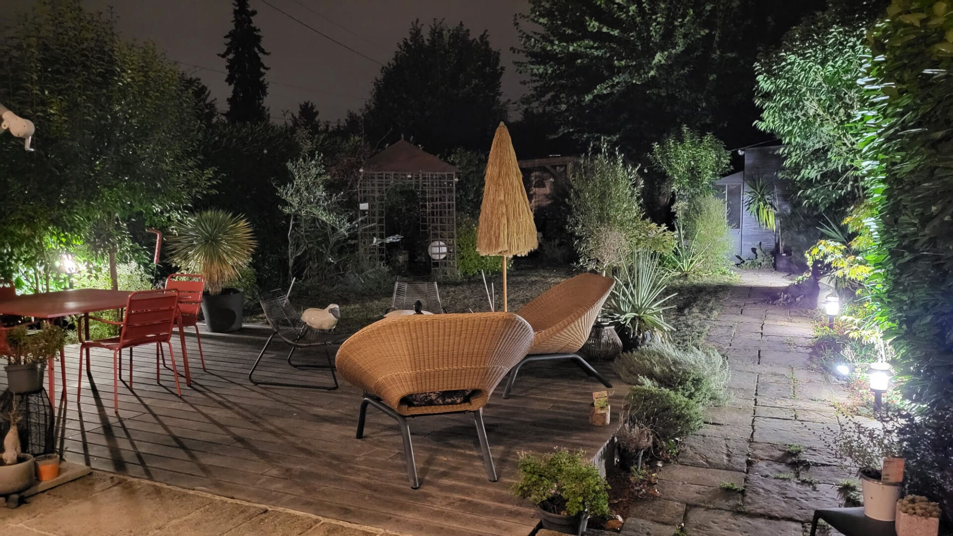 Charmant jardin clos sans vis à vis avec terrasse, espace détente, serre, garage, abris de jardin, carport. DPE C