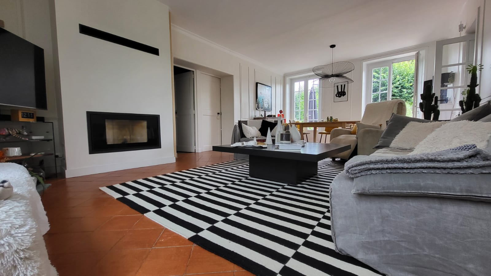 Au rez-de-chaussée : entrée, salon - séjour avec poêle à granulés chauffant aussi le haut, cuisine meublée et équipée (hotte et piano Lacanche), bureau avec bibliothèque, une chambre avec salle d'eau privative.