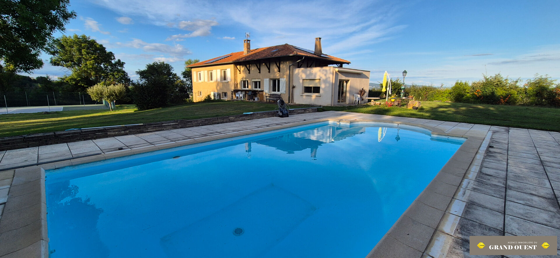 Au demi niveau inférieur vous trouverez, une buanderie et un grand garage double.. Le parc d'une surface de 8867 m² est clos et arboré avec un petit bois de chêne, une piscine et un magnifique tennis complètement refait.