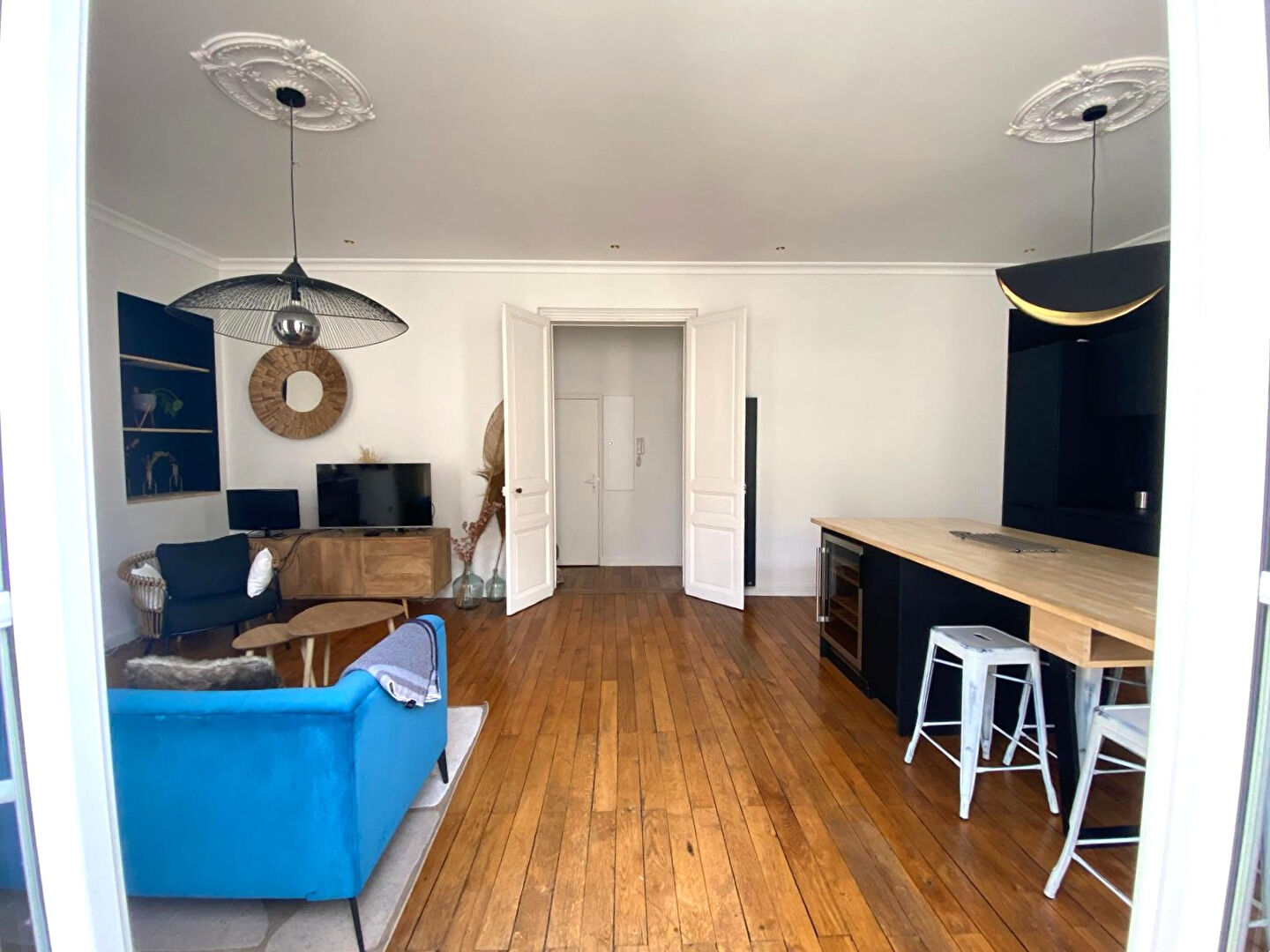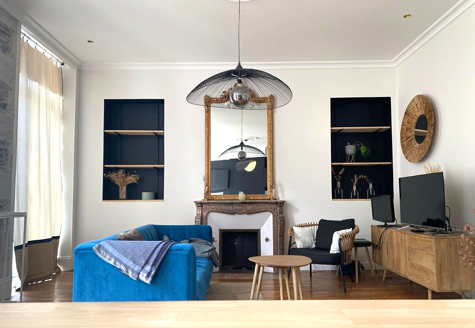 Parquet en bois massif, moulures, cheminées d'époque, hauteur sous plafond : les éléments de caractère ont été préservés et sublimés, tandis que la rénovation apporte une vraie sérénité au quotidien.