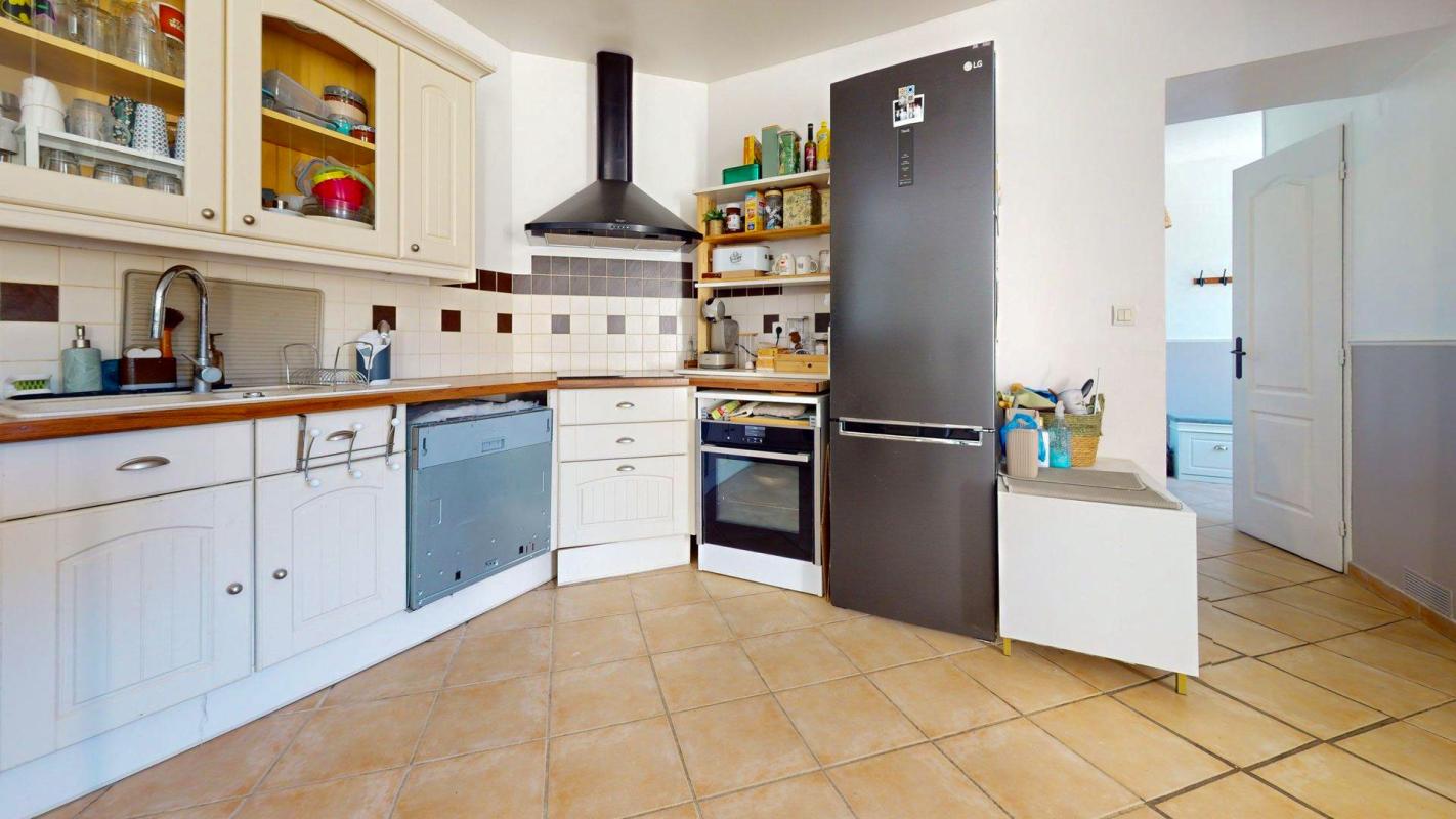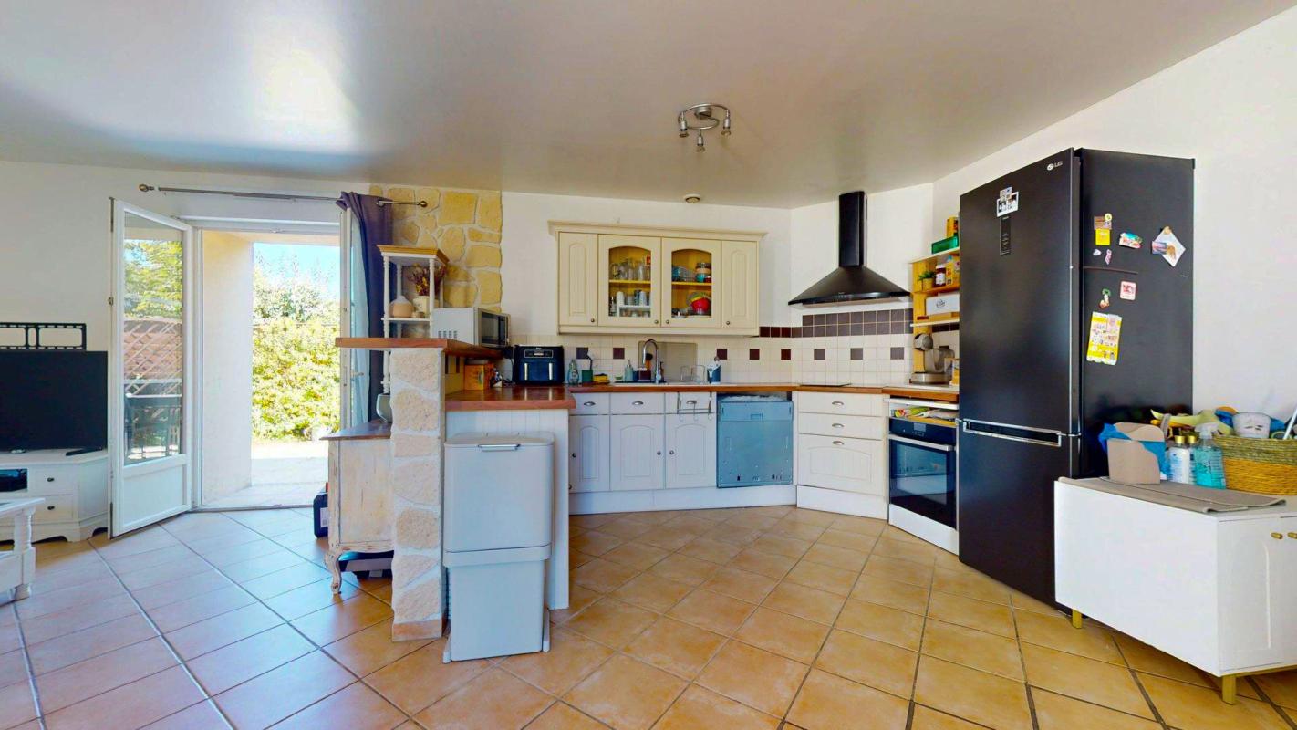 Elle se compose d'une entrée avec placard, un WC, une grande buanderie, une cuisine ouverte aménagée et équipée ouverte sur un double séjour donnant accès à une grande terrasse + un jardin arboré, sans vis-à-vis.