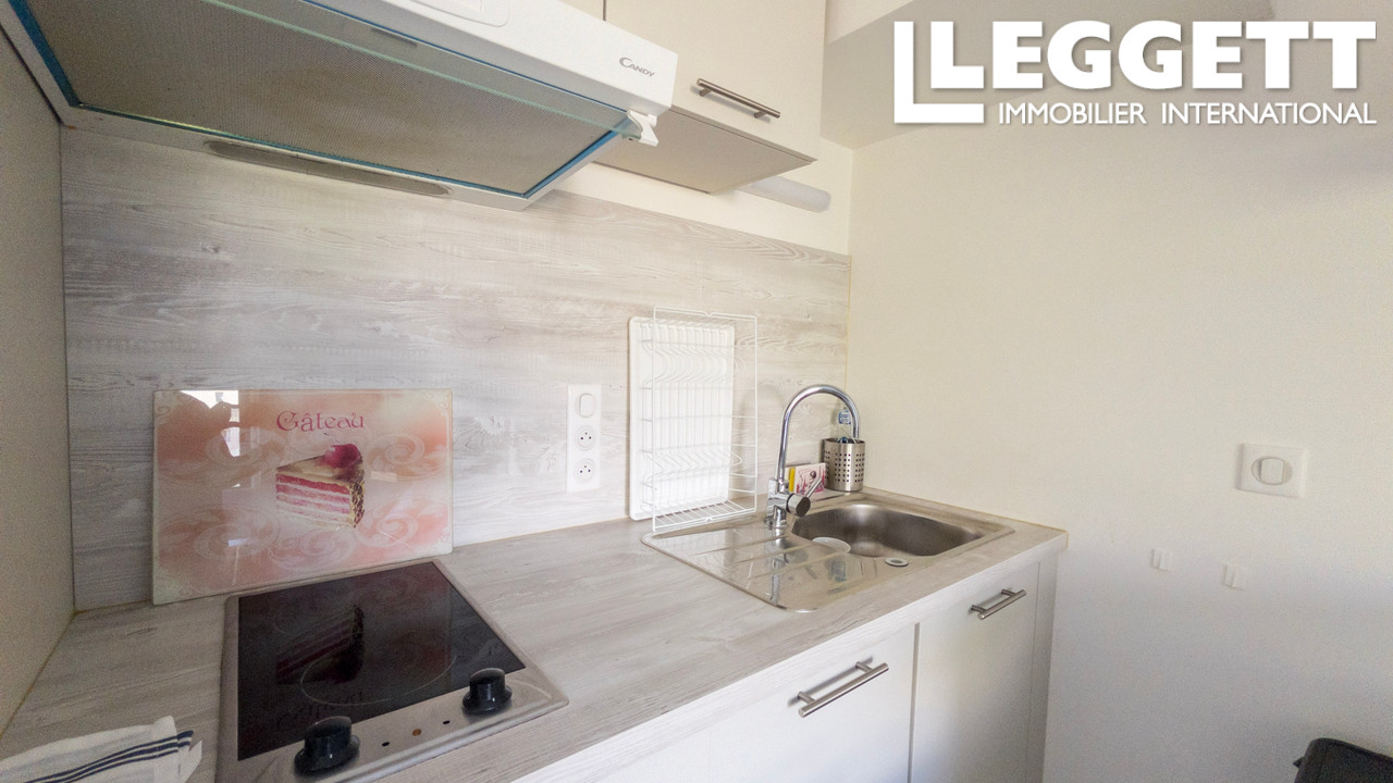 L'intérieur présente un agencement fonctionnel, comprenant une kitchenette, une salle d'eau avec douche et WC, ainsi qu'un petit placard intégré pour le rangement. C'est une configuration idéale pour un étudiant, une location saisonnière ou une résidence principale compacte.